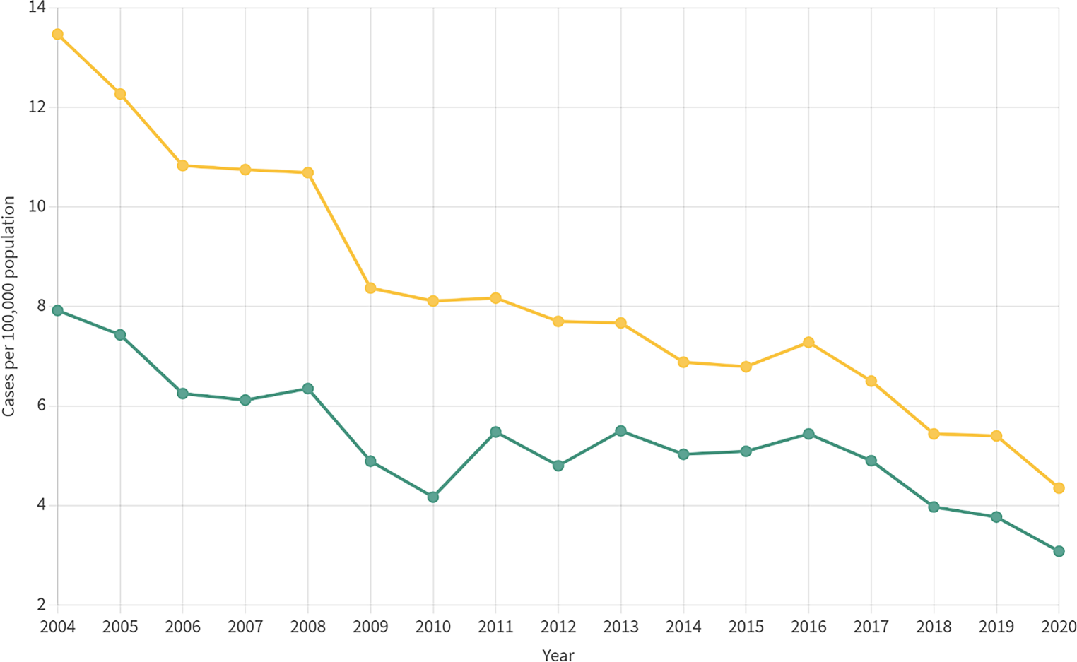 Reported cases of tuberculosis (yellow line) and microbiologically confirmed cases of Mycobacterium tuberculosis complex (green line) per 100,000 population in Austria (source: [46])