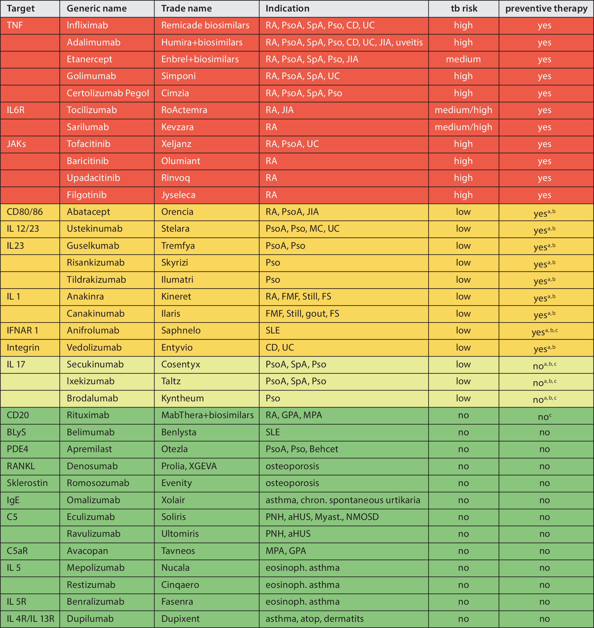 Heat map of bDMARDs and tsDMARDS regarding the risk of tuberculosis and need for preventive treatment; red: high risk, preventive treatment necessary, orange: low risk, preventive treatment necessary, yellow: low risk, preventive treatment not necessary, green: no risk, preventive not necessary. TNF tumor necrosis factor, IL interleukin, IFNAR1 type I interferon receptor, JAKs Janus kinase inhibitor, BlyS B-lymphocyte stimulator, PDE4 phosphodiesterase 4 inhibitor, RANKL receptor activator of NF-κB ligand, IgE immunoglobulin E, RA rheumatoid arthritis, PsoA psoriatic arthritis, SpA spondylarthritis, Pso psoriasis, CD Crohn’s disease, UC ulcerative colitis, JIA juvenile idiopathic arthritis, FMF familial Mediterranean fever, Still systemic juvenile idiopathic arthritis, adult onset Still’s disease, FS fever syndromes, SLE systemic lupus erythematosus, PNH paroxysmal nocturnal hemoglobinuria, aHUS atypical hemolytic uremic syndrome, Myast. myasthenia gravis, NMOSD neuromyelitis optica spectrum disorder, MPA microscopic polyangiitis, GPA granulomatosis with polyangiitis. aLow incidence, due to routinely screening in studies. bTheoretical risk low. cAccording to the summary of product characteristics, this does not require screening