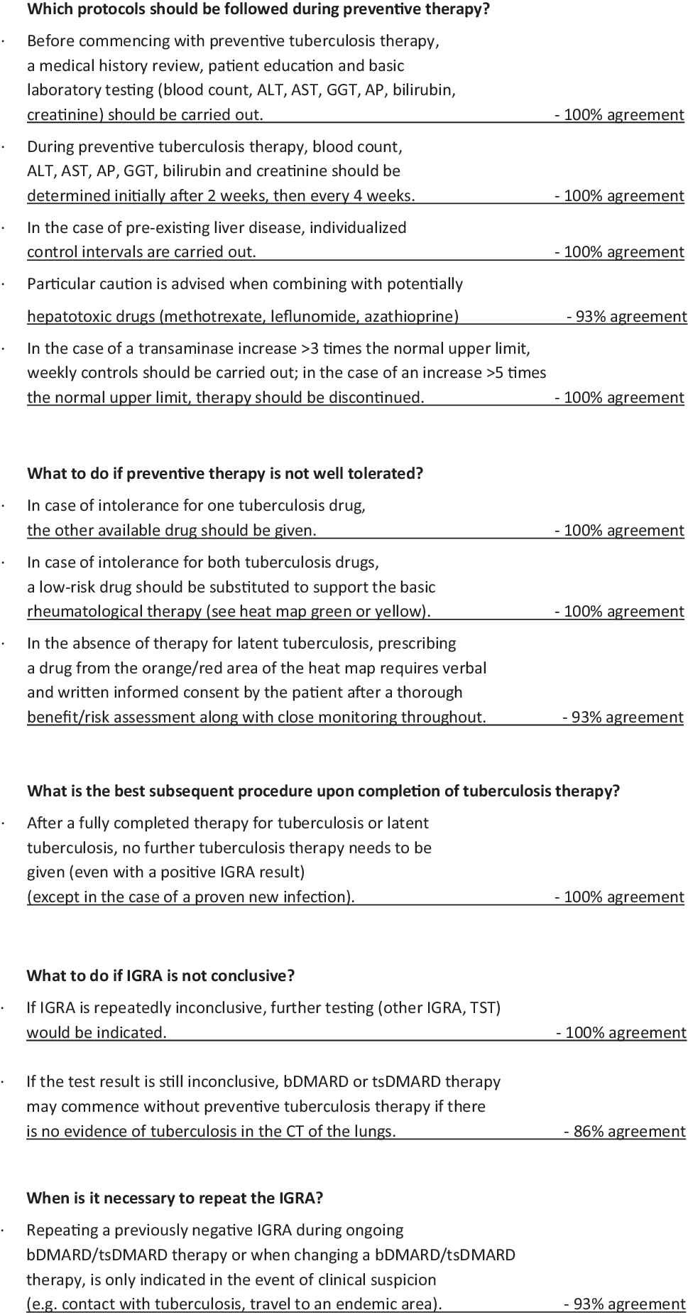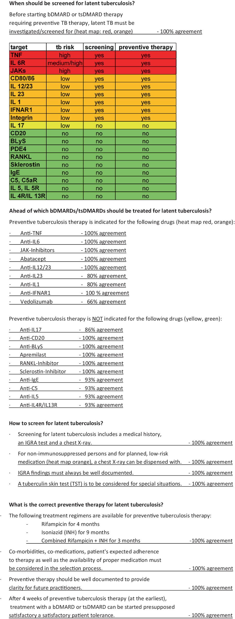 Before starting bDMARD or tsDMARD therapy requiring preventive TB therapy, LTBI must be investigated/screened for (see heat map in Fig. 2: red, orange): 100% consensus.