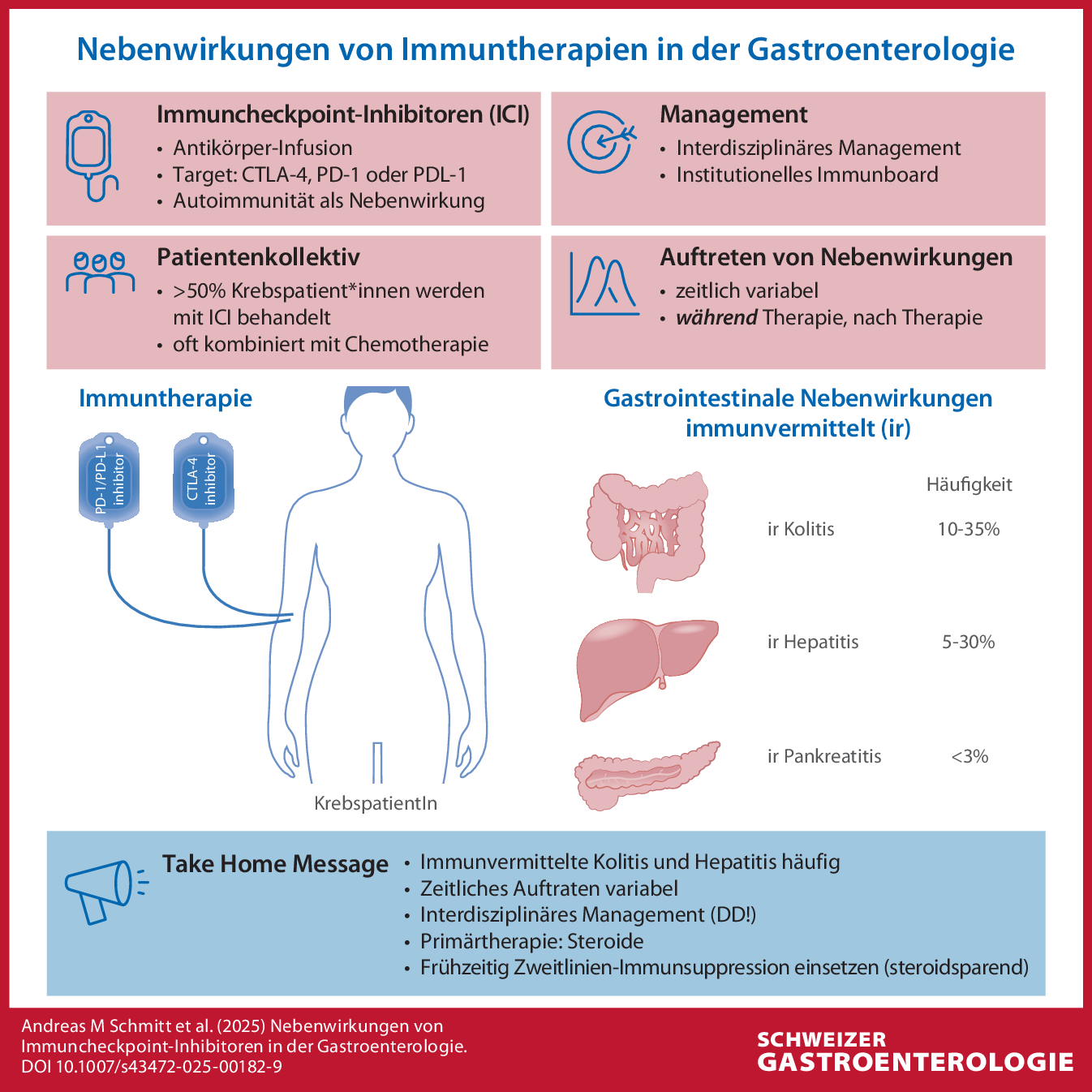 Am Universitätsspital Basel erfolgt das Management von irAE im Rahmen des Kompetenznetzwerks Immuntherapie. Dieses setzt sich aus Fachvertreter*innen der medizinischen Onkologie sowie aller relevanten organbezogenen Disziplinen zusammen, die über Erfahrung in der Diagnostik und Therapie von irAE verfügen. Ziel ist die zeitnahe und standardisierte Versorgung betroffener Patient*innen. Komplexe oder therapieresistente Verläufe werden im interdisziplinären Immunboard diskutiert. Im vorliegenden Artikel stellen wir pragmatische Ansätze zur Abklärung und therapeutischen Vorgehensweise bei den häufigsten irAE im Bereich der Gastroenterologie vor.