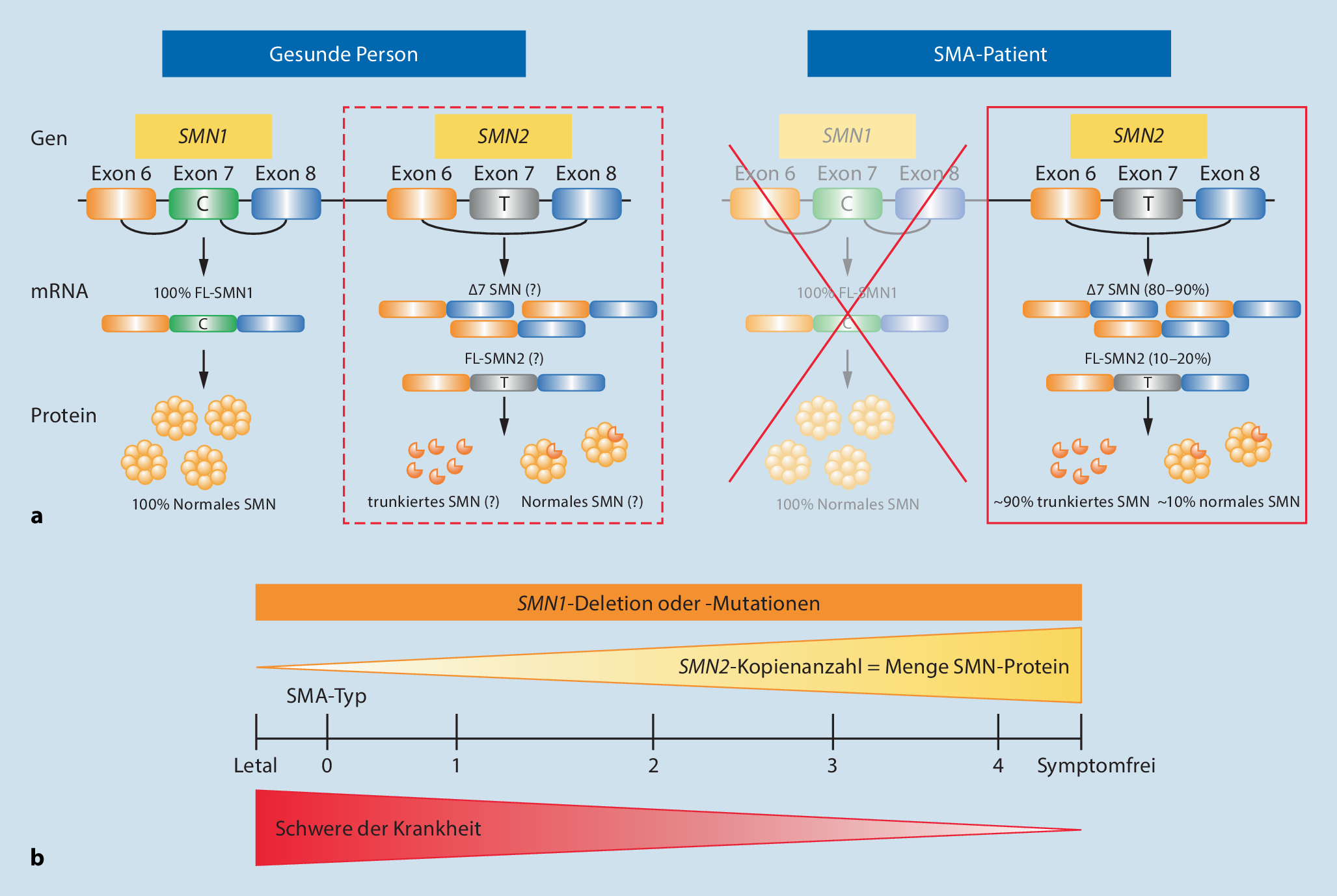 Im menschlichen Genom existiert eine nahezu identische Kopie des SMN1-Gens, nämlich das SMN2-Gen. Dieses unterscheidet sich vom SMN1-Gen nur durch ein einziges Nukleotid (Austausch C zu T auf Exon 7), aufgrund dessen verändert sich das Spleißen und Exon 7 wird bei der Transkription ausgelassen, sodass größtenteils ein trunkiertes, biologisch nicht wirksames Protein entsteht [5, 6].