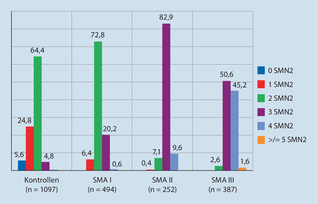 Prozentuale Verteilung der SMN2-Genkopien bei Kontrollen und Patienten mit den Typen I–III der spinalen Muskelatrophie (SMA) (Modifiziert nach Rudnik-Schöneborn und Zerres [19])