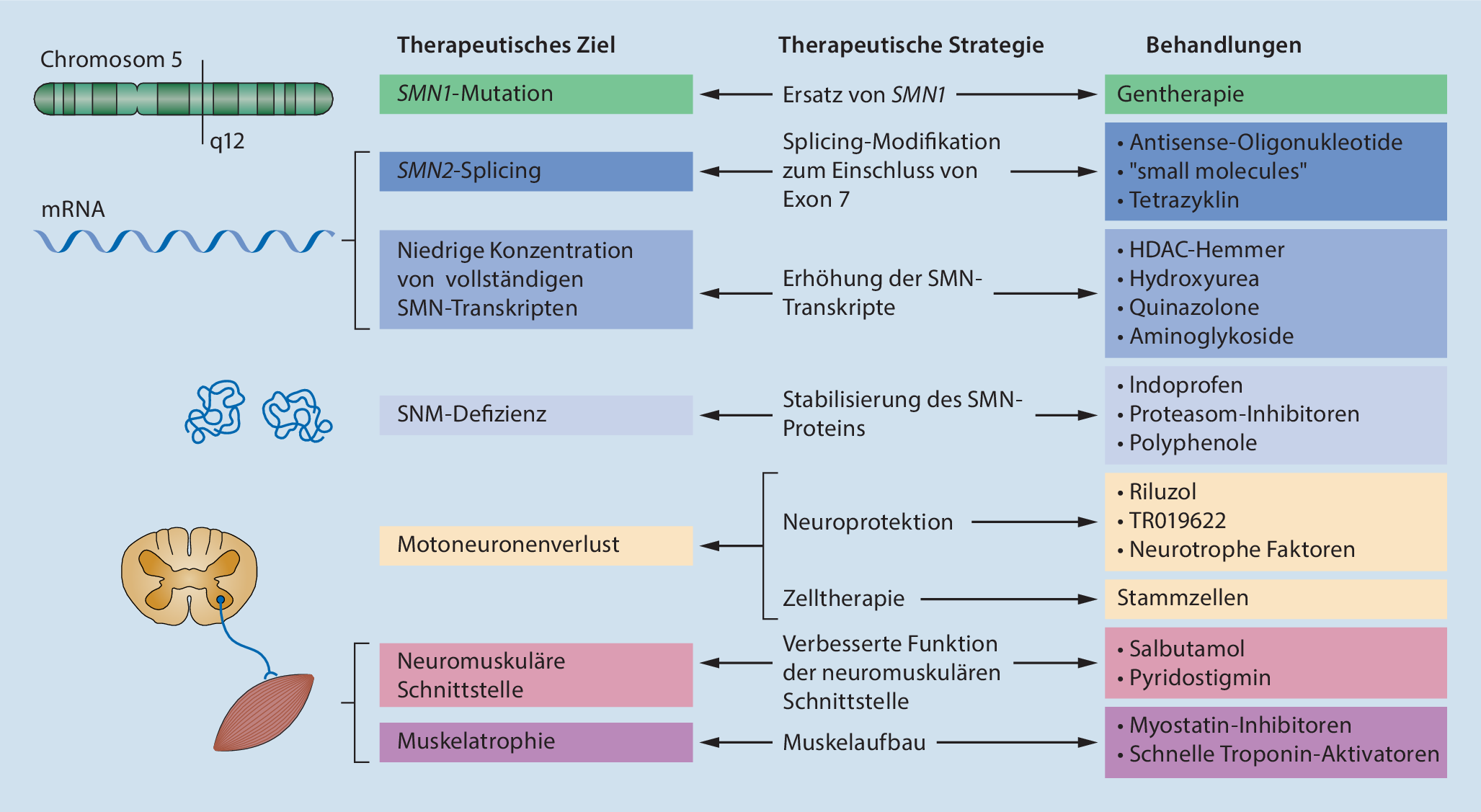 In den letzten Jahren hat sich in den Therapiemöglichkeiten der SMA sehr viel verändert. Erstmals stehen uns zur Behandlung der SMA Medikamente mit verschiedenen Therapieansätzen (Abb. 3) zur Verfügung. Die vielversprechendsten befassen sich mit der Erhöhung der Produktion von SMN-Protein, entweder über einen Splicing-Modifier, der auf dem SMN2-Gen ansetzt, oder über einen Ersatz des defekten SMN1-Gens.