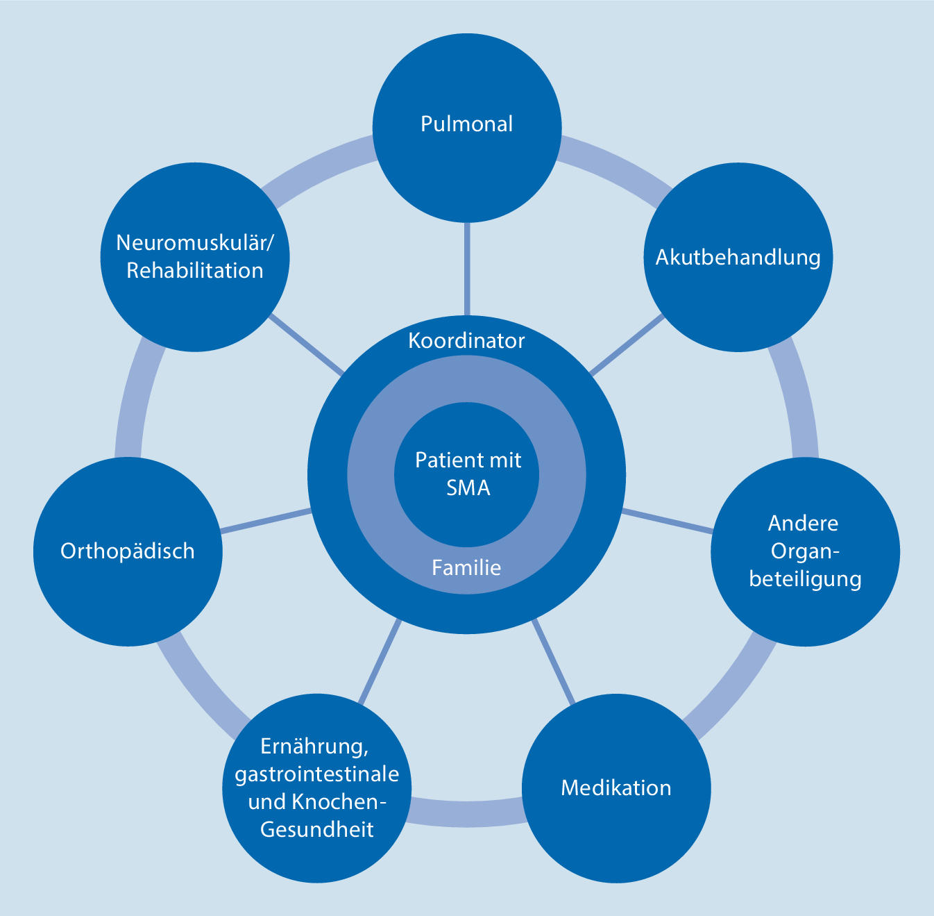 In der Betreuung der betroffenen Patienten dürfen trotz der verfügbaren Medikamente nicht die von Mercuri et al. sowie Finkel et al. zuletzt 2018 publizierten „Standards of Care“ vergessen werden [16, 17]. Diese Empfehlungen sind nach wie vor gültig und stellen die Basis für eine optimale Patientenbetreuung dar. (Abb. 4).