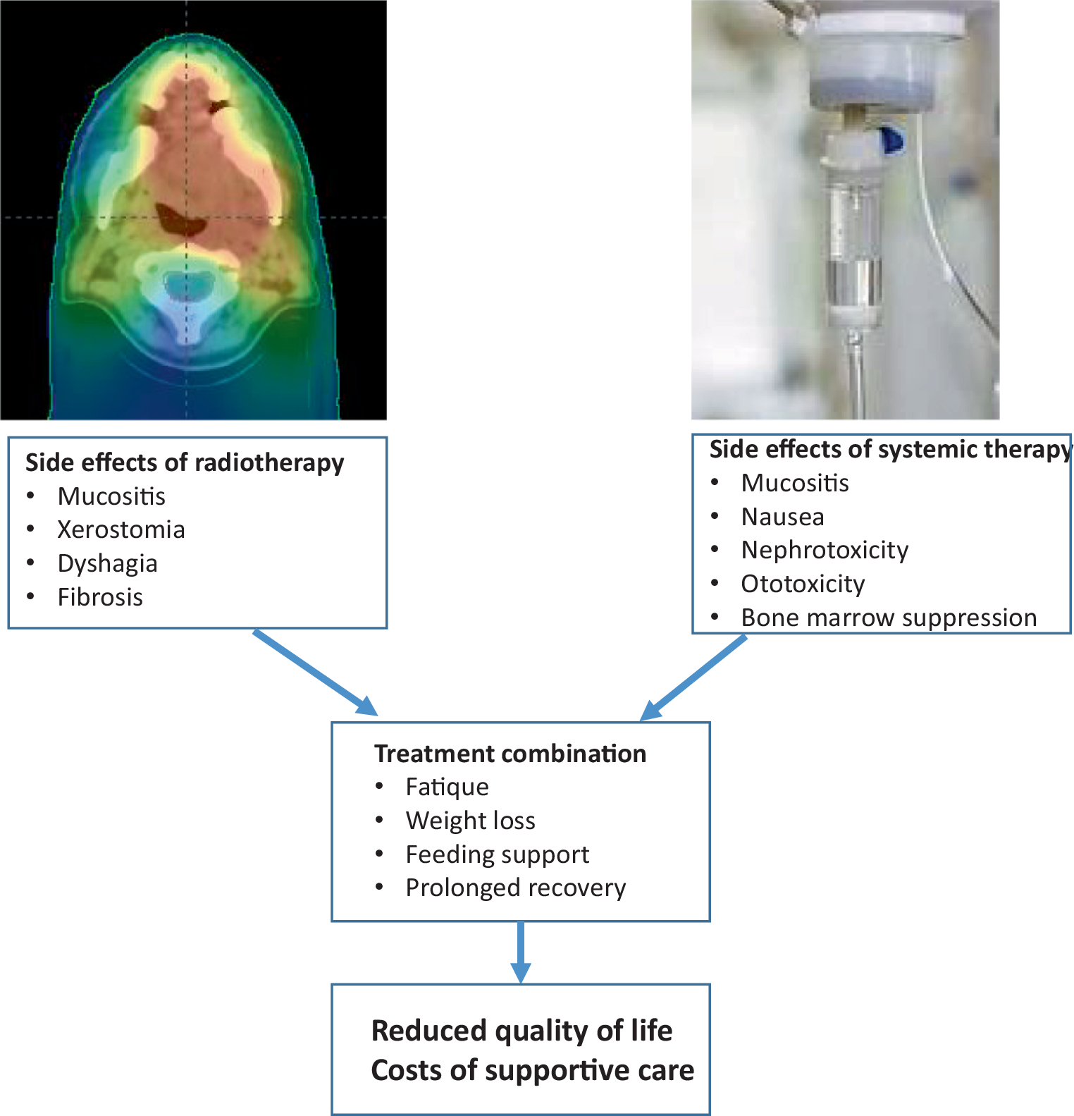 Treatment of head and neck cancer remains challenging. Combination of multiple treatments (e.g. surgery, radiotherapy, chemotherapy and immunotherapy) is necessary in order to improve the treatment outcome. However, the toxicity of treatment is increasing with treatment combinations because of cumulative side effects, often associated with worse quality of life and need for advanced supportive treatment (Fig. 1). In addition, older frail patients are often not ideal candidates for standard treatment of care and need treatment adaptations.