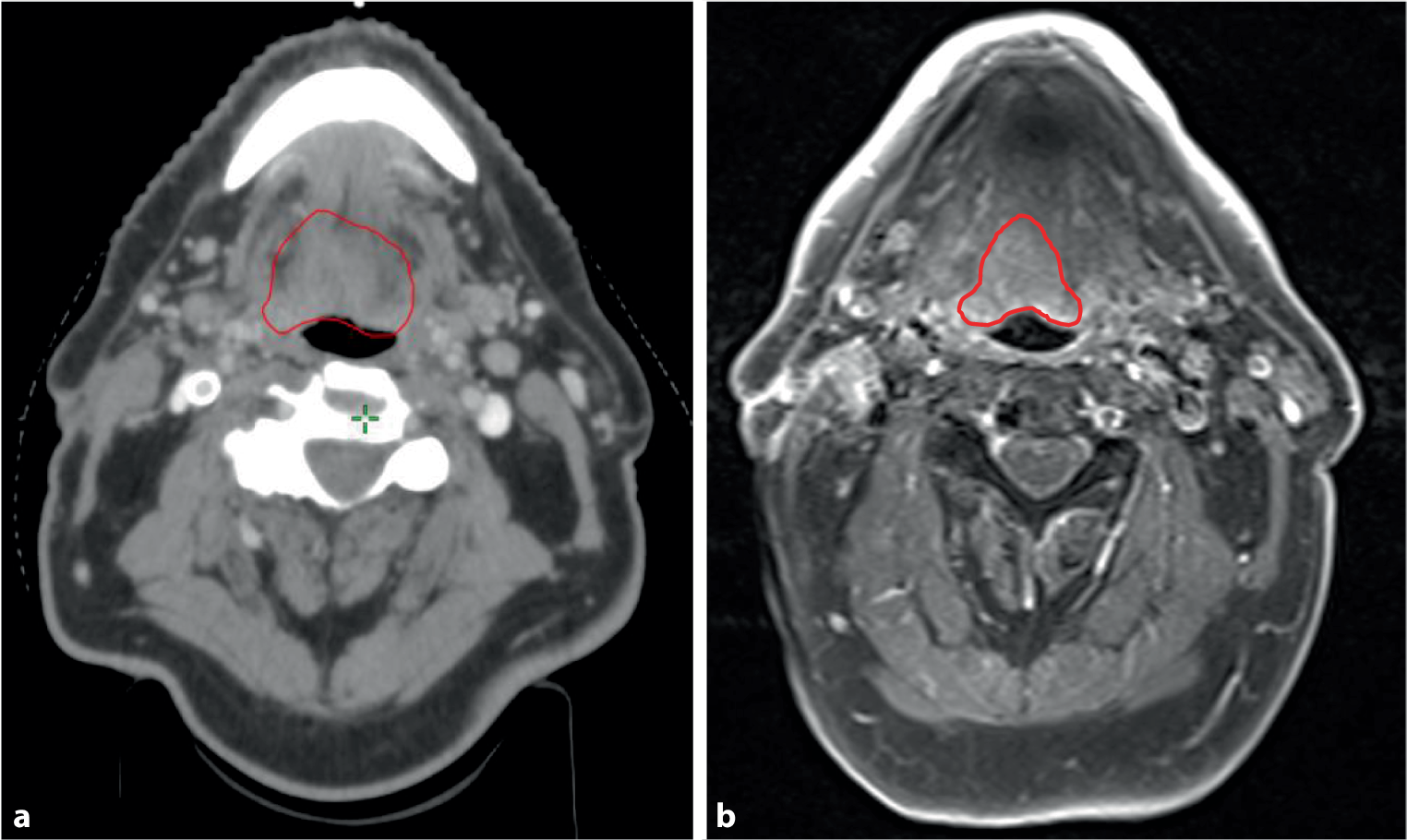 Tumour volume (red) definition using computed tomography (CT) and MRI. MRI allows better soft tissue contrast for head and neck cancers with improving the precision of contouring. This can result in smaller volumes with reduction of irradiated volume: a CT-based target contouring, b MRI-based target contouring