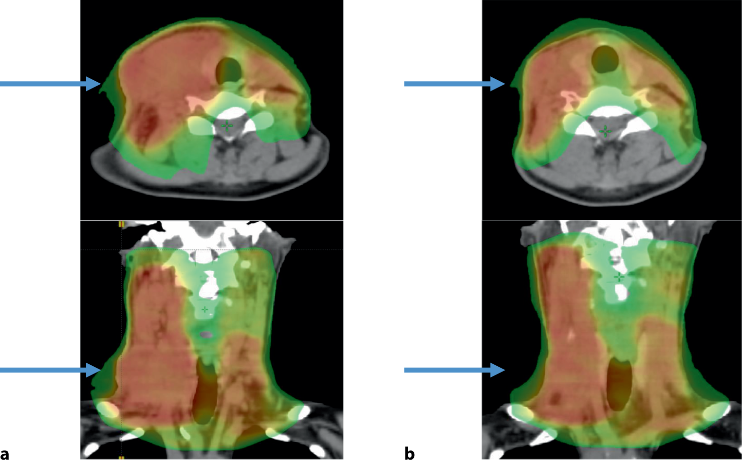 With technological improvements in RT delivery leading to better dose conformity, such as IMRT, volumetric arc radiotherapy (VMAT) and proton therapy, additional attention may be dedicated to reducing the overall RT dose to healthy tissue without compromising the tumour dose. A reduction in the dose to critical structures, e.g. the salivary glands, resulted in reduced long-term toxicity and improved quality of life [12]. Together with improved target definition using advanced imaging (magnetic resonance imaging [MRI], PET/CT), improved accuracy of radiation delivery using image-guided radiotherapy (IGRT) and even reacting to tumour volume changes during the treatment course through image-guided adaptive radiotherapy (IGART), the overall toxicity can be reduced without treatment de-intensification to the tumour site ([13], Figs. 2 and 3).