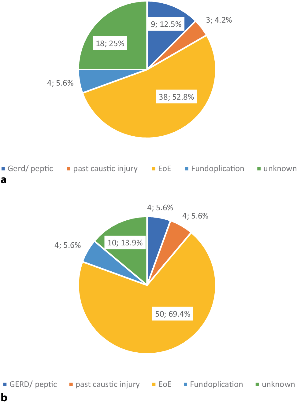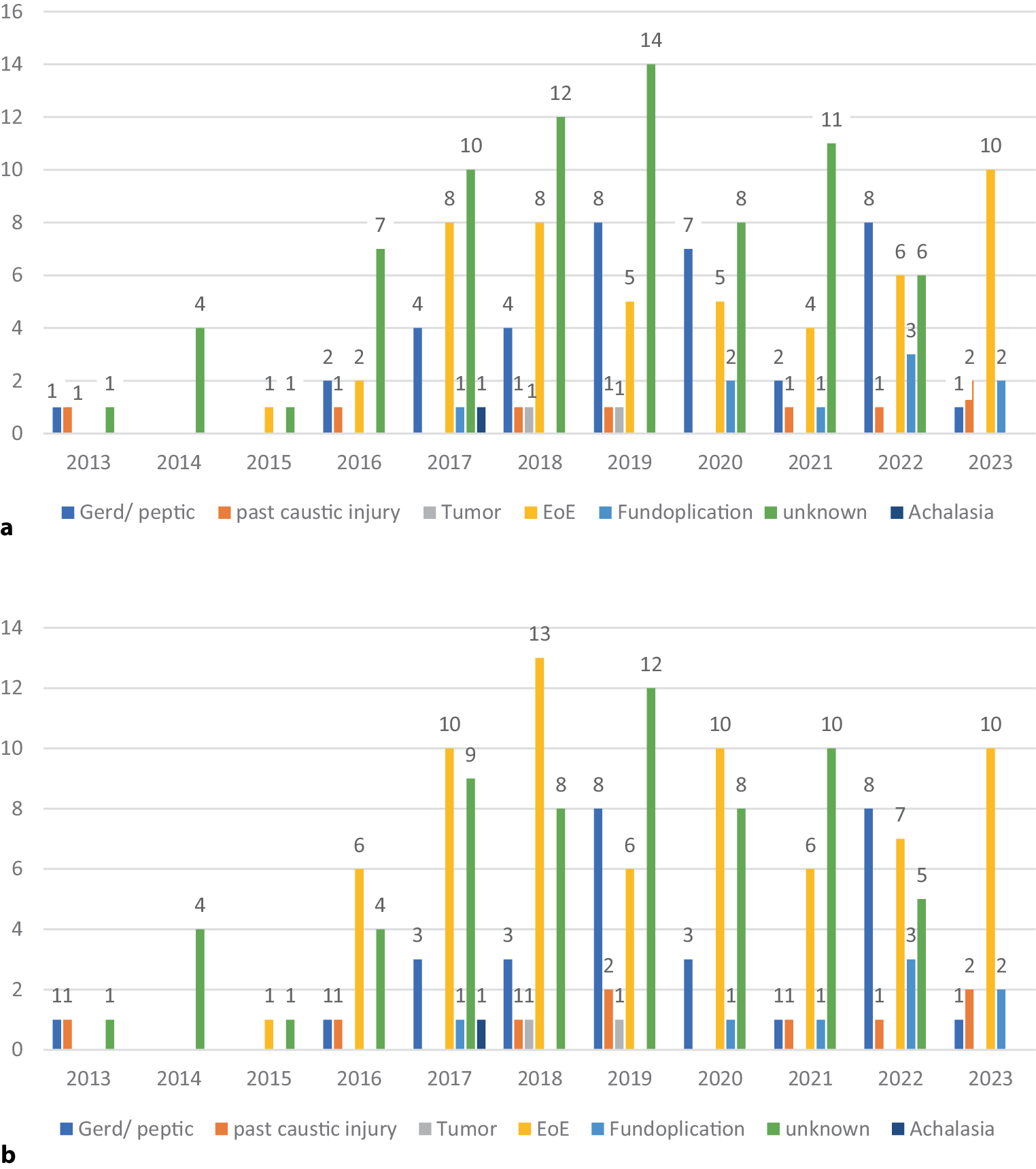 We assessed the biopsy rate and the etiology of EFI (with and without previously diagnosed EoE) in patients referred to the ED of the Vienna general hospital (Allgemeines Krankenhaus [AKH] Wien) between 2013 and 2023. The data for the chart review were derived from the patient history in the hospital’s respective computer system (AKIM). A search for “bolus impaction, food impaction, impaction” was done and patients with an EFI needing an esophagogastroduodenoscopy (EGD) were included. The suspected reason for EFI was derived from the endoscopy report. Additionally, all endoscopy reports including images and patient histories were again reviewed by an experienced physician in EoE (PS) who made a suspected final diagnosis.
