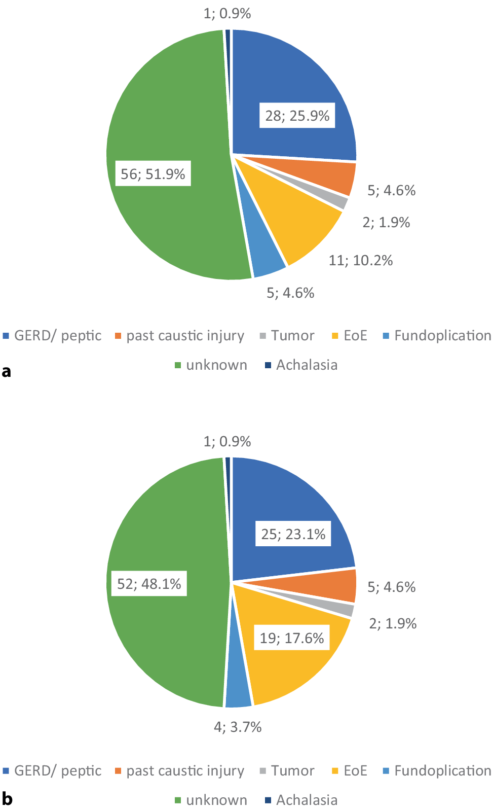 In patients < 50 years of age (n = 72), the main suspected diagnosis was EoE, followed by an unknown etiology and GERD (Fig. 2). In people ≥ 50 years of age (n = 108), the etiology remained unknown in half of patients, followed by GERD (n = 25, 23%) and EoE (n = 19, 18%) (Fig. 3).