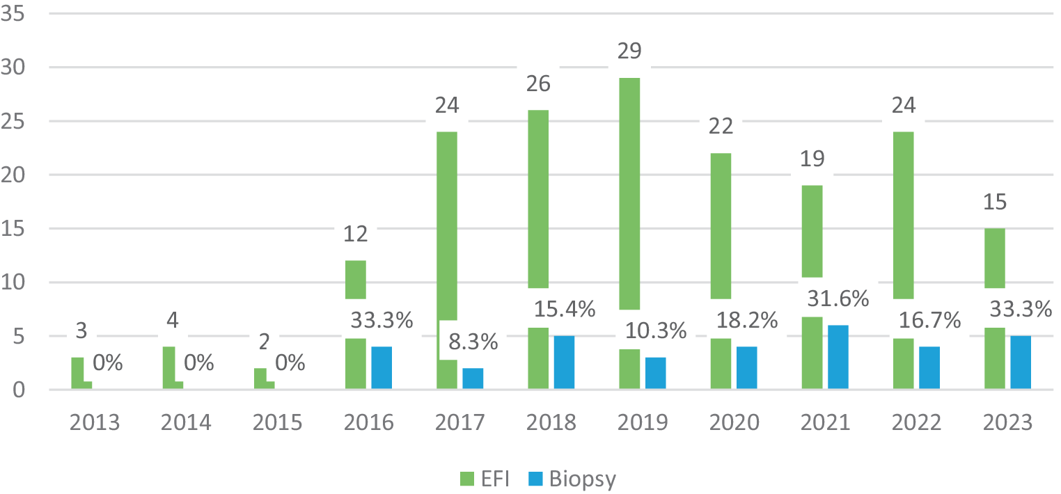 From 2013–2023, biopsy was taken in 18% of EFI cases without an increase in recent years (Fig. 4). However, when a diagnosis of EoE was suspected, a biopsy was obtained in 48%.