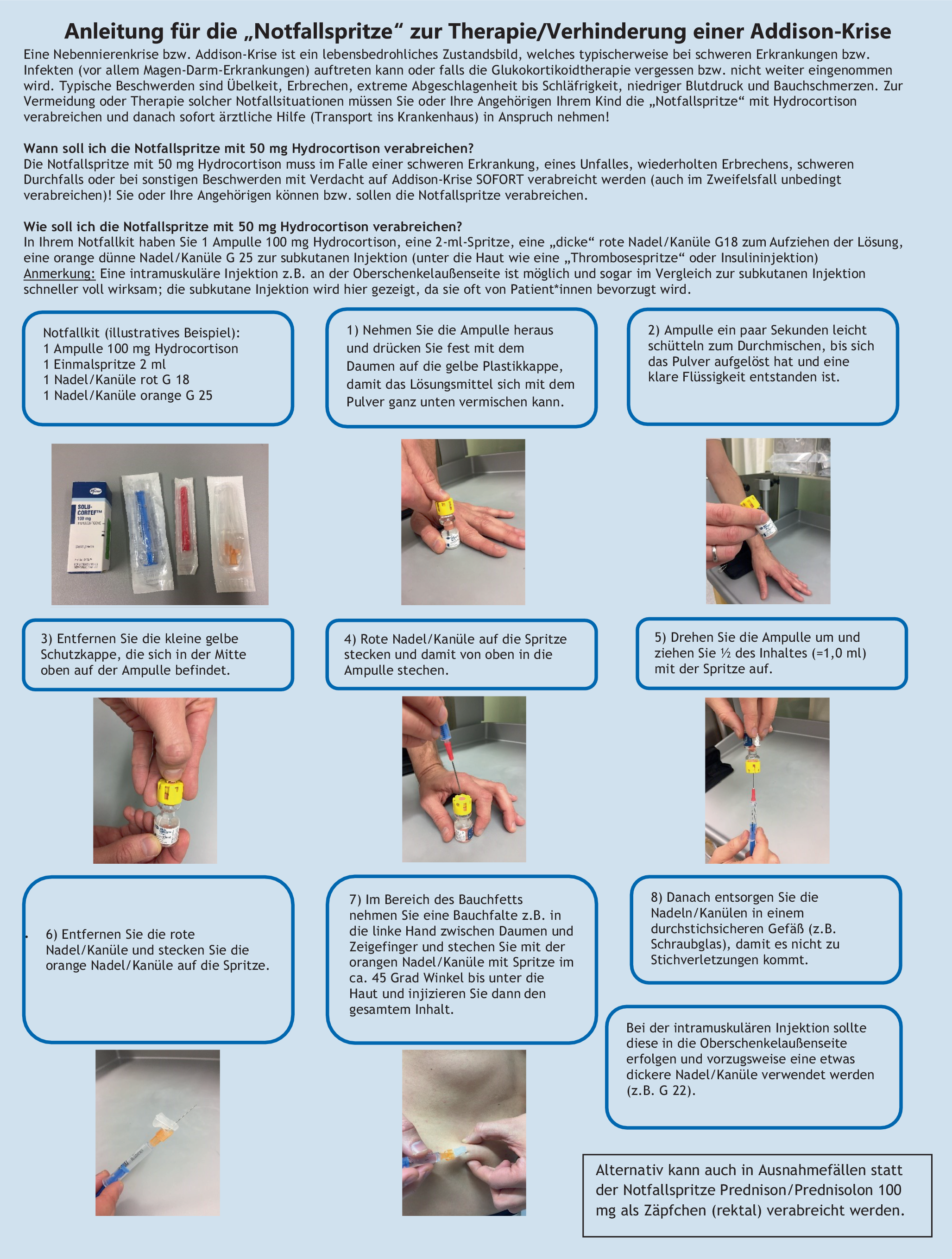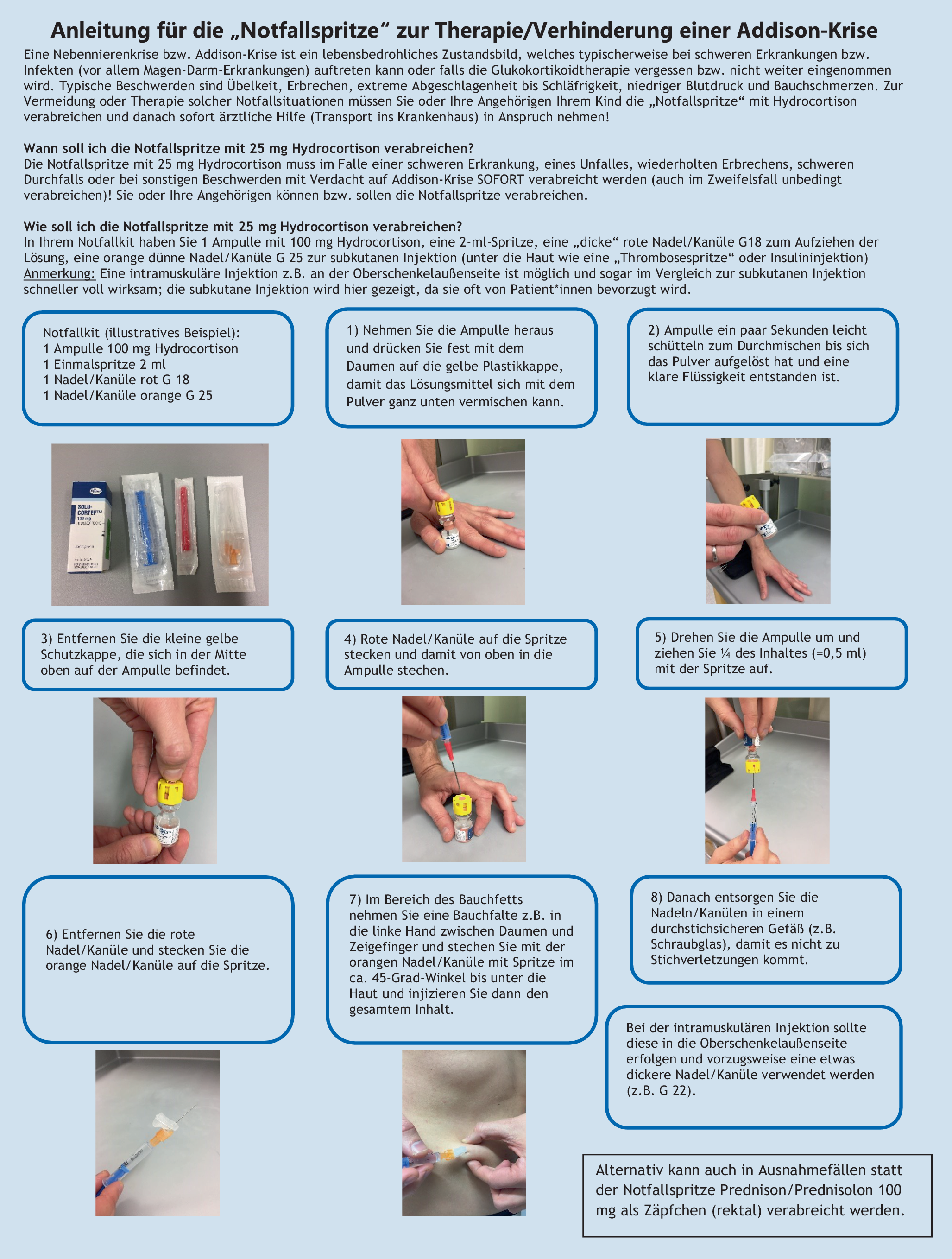 Versorgung mit einem Hydrocortison-Notfallkit zur Injektion (alternativ auch andere Glukokortikoidpräparationen, z. B. Suppositorien/Zäpfchen zur Notfallapplikation) sowie mit ausreichenden oralen Glukokortikoiddosen für Stresssituationen/Erkrankungen.