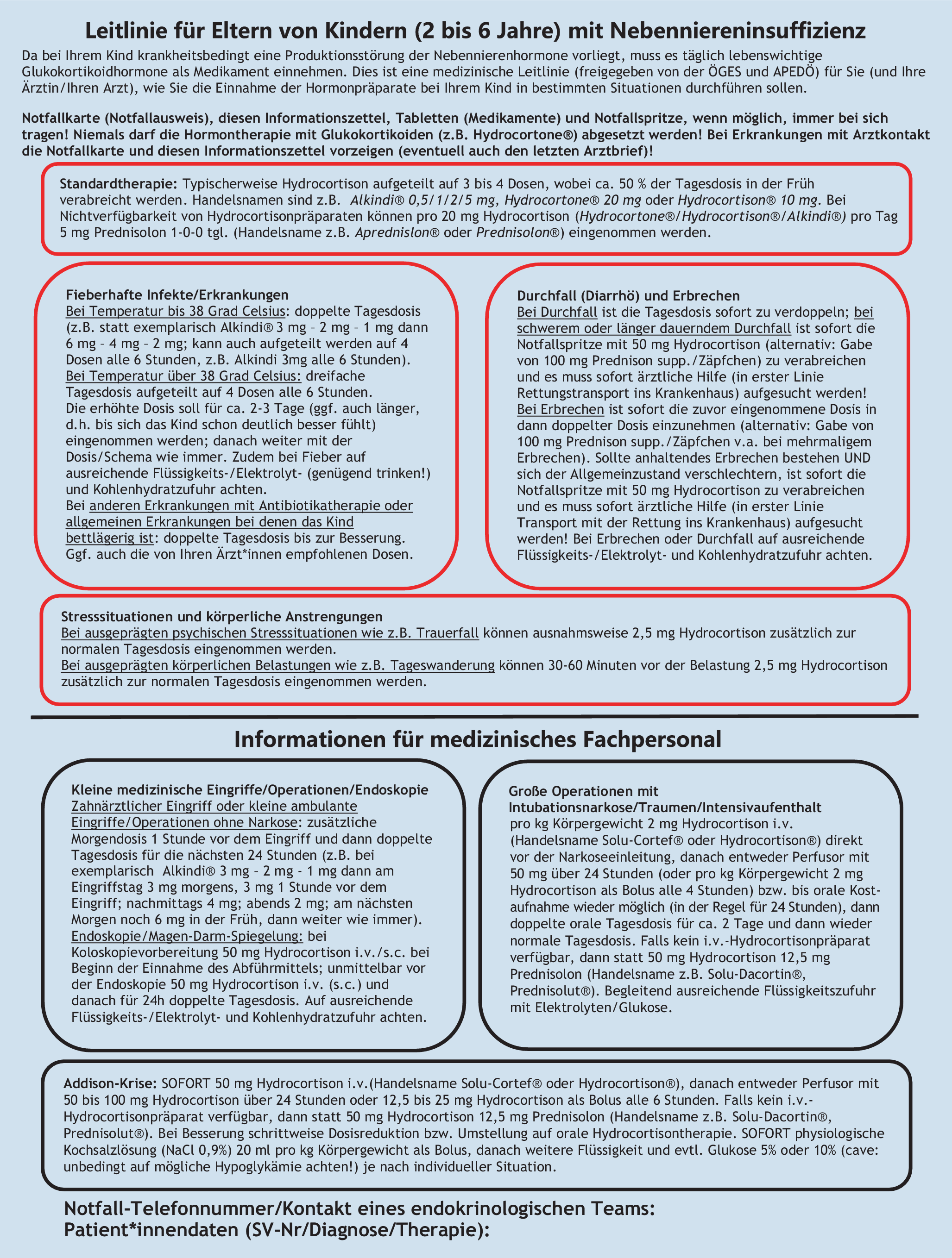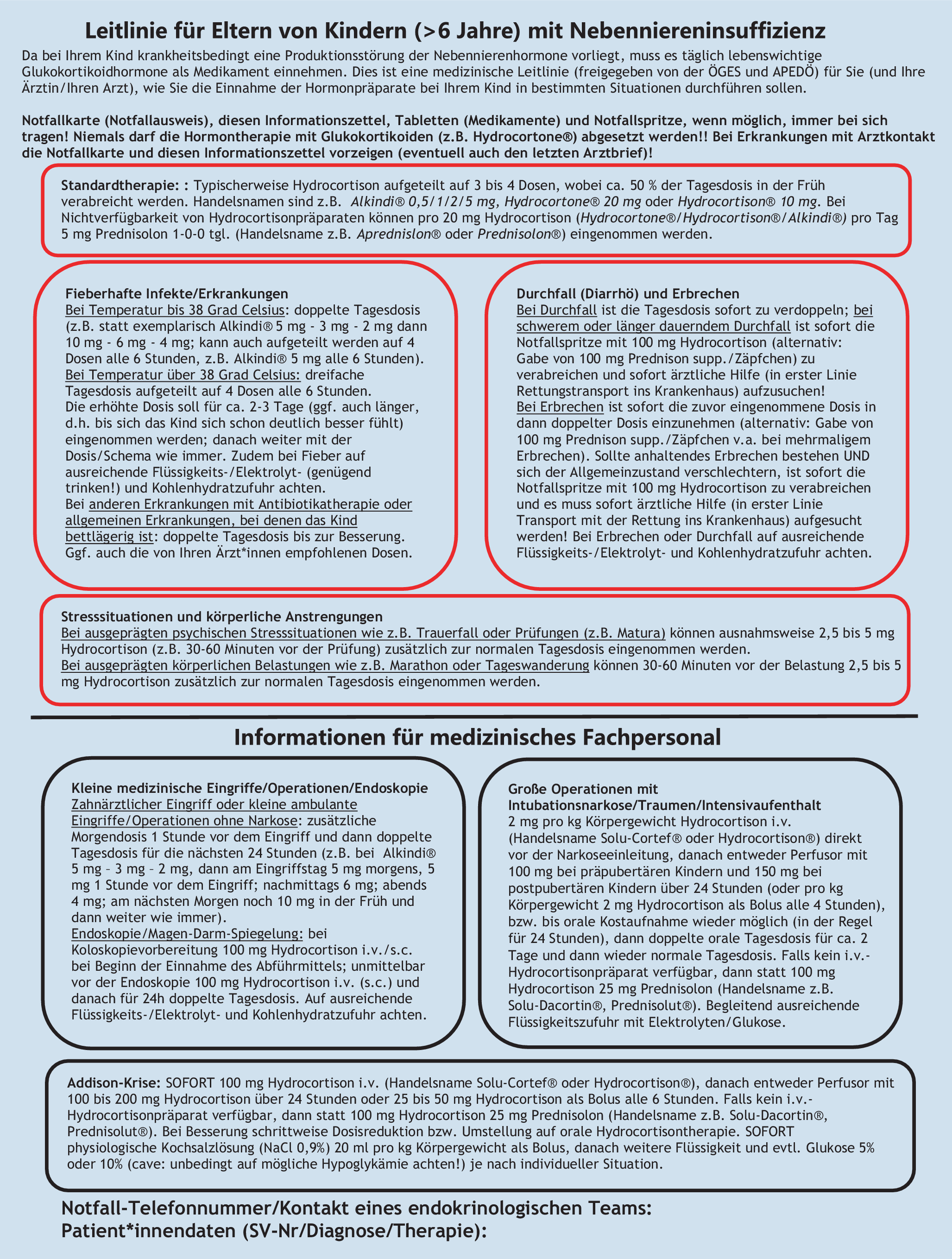 Wir empfehlen, dass jeder Patient bzw. jede Patientin mit NNI immer (!) einen Informationszettel (Behandlungsleitlinie) bei sich trägt mit Instruktionen für medizinisches Fachpersonal, wie eine Nebennierenkrise zu behandeln ist bzw. wie man bei medizinischen Eingriffen/Stresssituationen/Erkrankungen die Glukokortikoidtherapie dosieren sollte. Für diese Informationszettel für Erwachsene, Kinder > 6 Jahren, Kinder von 2 bis 6 Jahren und Kinder von 0 bis < 2 Jahren siehe die Abb. 1, 2, 3 und 4. Diese Informationszettel (Behandlungsleitlinien) sollen kein Ersatz für die Behandlung bzw. Beratung durch die betreuenden Ärzt*innen sein und sind beschränkt auf eine Auswahl von Verhaltensregeln in Stresssituationen bzw. bei Erkrankungen, die aus Platzmangel nicht detaillierter ausformuliert wurden, weswegen wir bei Unklarheiten in erster Linie auf den Volltext dieses Konsensusdokuments bzw. die jeweils betreuenden Ärzt*innen verweisen.