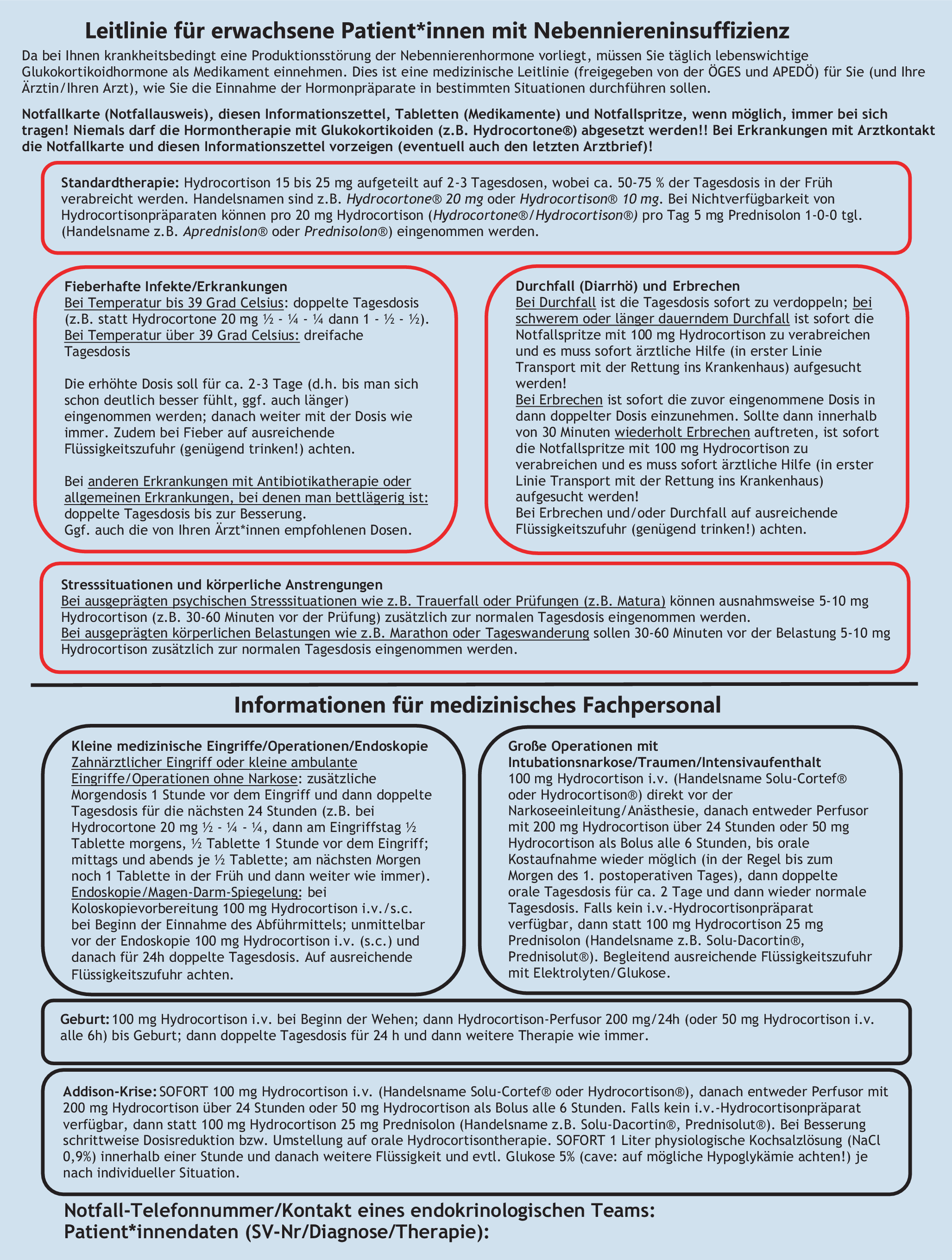 Informationszettel (Behandlungsleitlinie) zur Therapie der Nebennierenkrise sowie Dosisanpassungen/Verhalten bei Stresssituationen/Operationen/medizinischen Eingriffen, welcher dem Gesundheitspersonal gezeigt werden soll