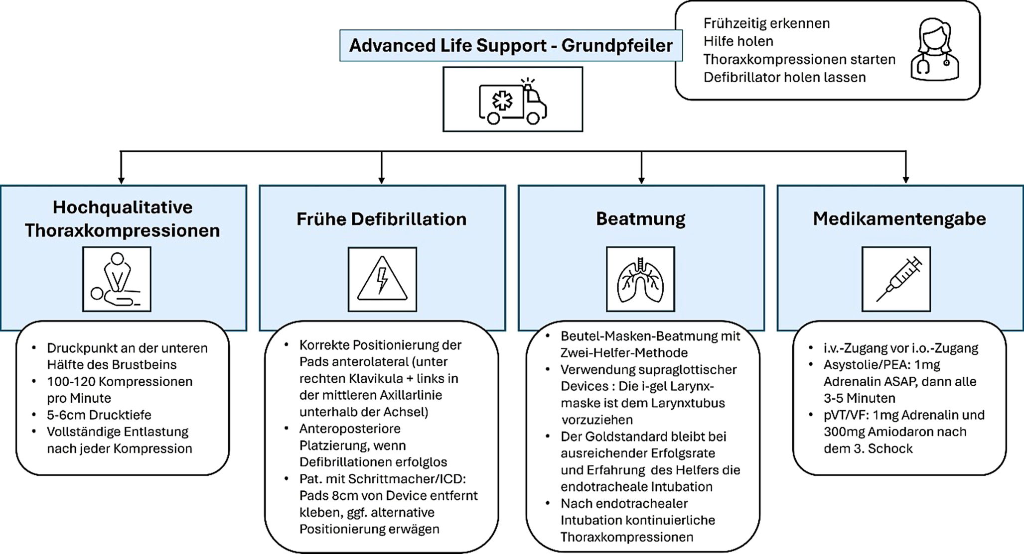Die vier Säulen der Reanimationsmaßnahmen im Advanced Life Support (ALS) bei Erwachsenen bestehen aus hochqualitativen Thoraxkompressionen, der frühzeitigen Defibrillation, der Beatmung sowie der Medikamentengabe