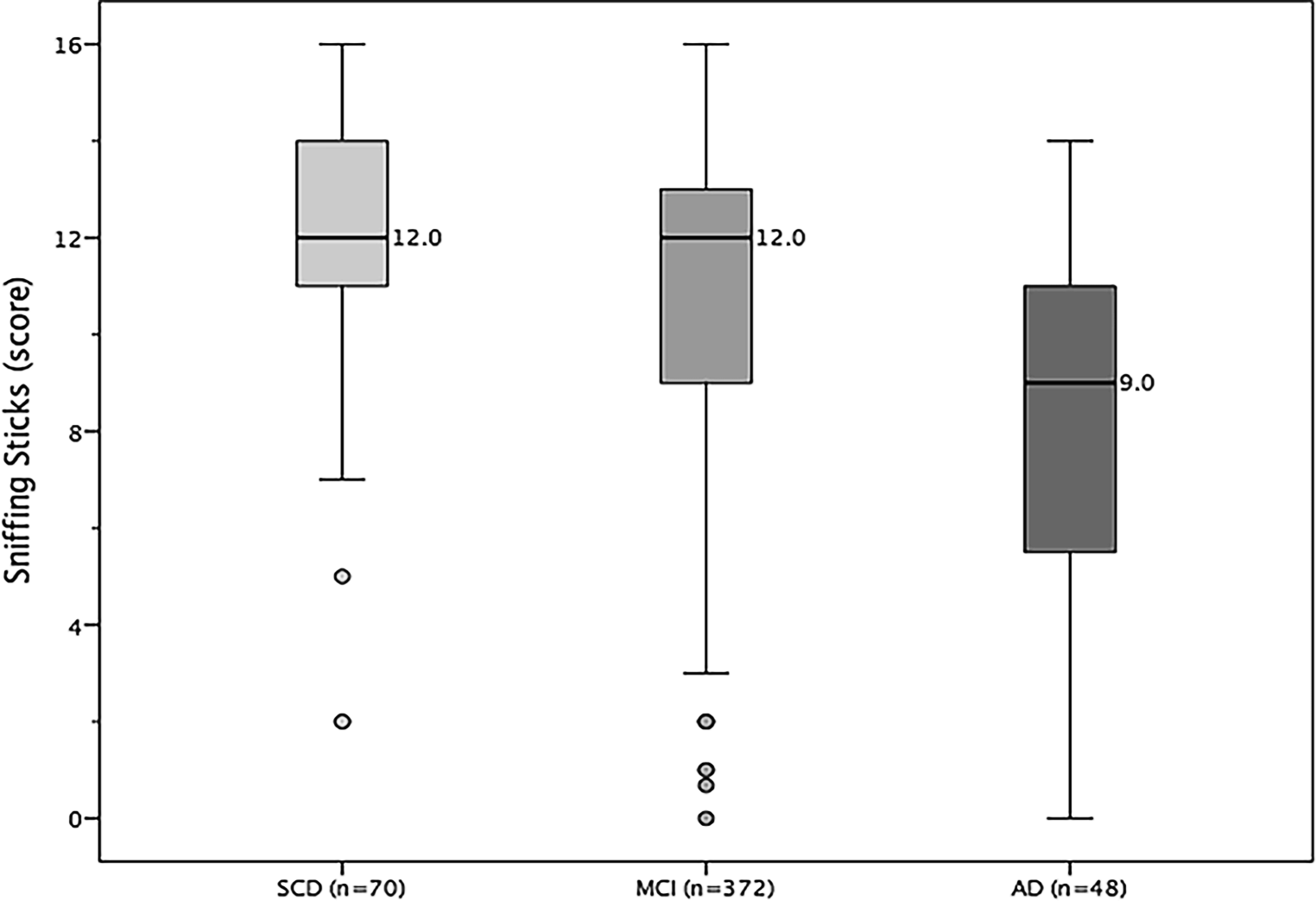 Distribution of olfactory performance (Sniffin’ Sticks identification score, with median) for the diagnostic subgroups. SCD Subjective Cognitive Decline, MCI Mild Cognitive Disorder, AD Alzheimer’s Disease