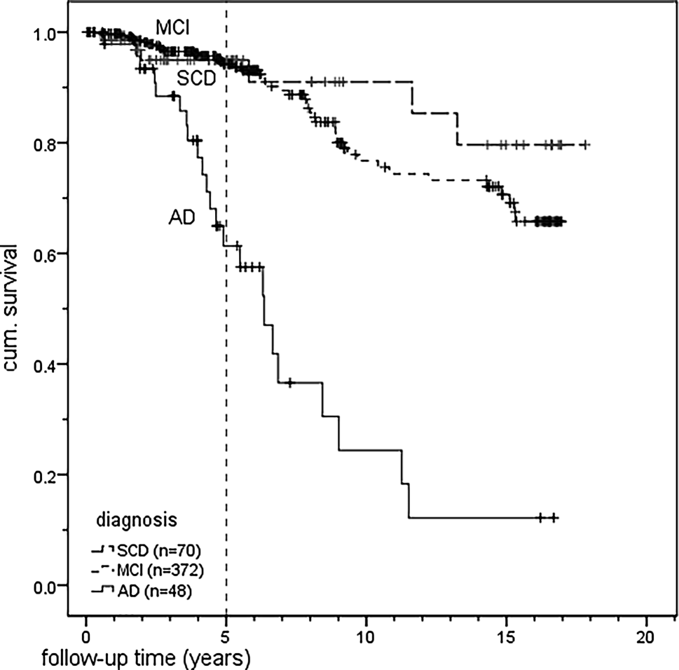All patients underwent a full physical and neurological examination with use of various screening tests. Furthermore, computed tomography (CT) and magnetic resonance imaging (MRI) scans were performed in most of the patients. The classification into SCD required the presence of subjective memory deterioration as manifested by the seeking of medical help for memory problems and by the concurrent absence of any objectively, measurable cognitive deficits (mean z‑score of each domain greater than −1.5 standard deviation [SD]; Jessen et al., 2014). MCI was determined by a mean z‑score of at least one domain of cognitive functions being below −1.5 SD [22, 27]. AD patients were diagnosed using the NINCDS-ADRDA (National Institute of Neurological Disorders and Stroke-Alzheimer’s Disease and Related Disorders Association).