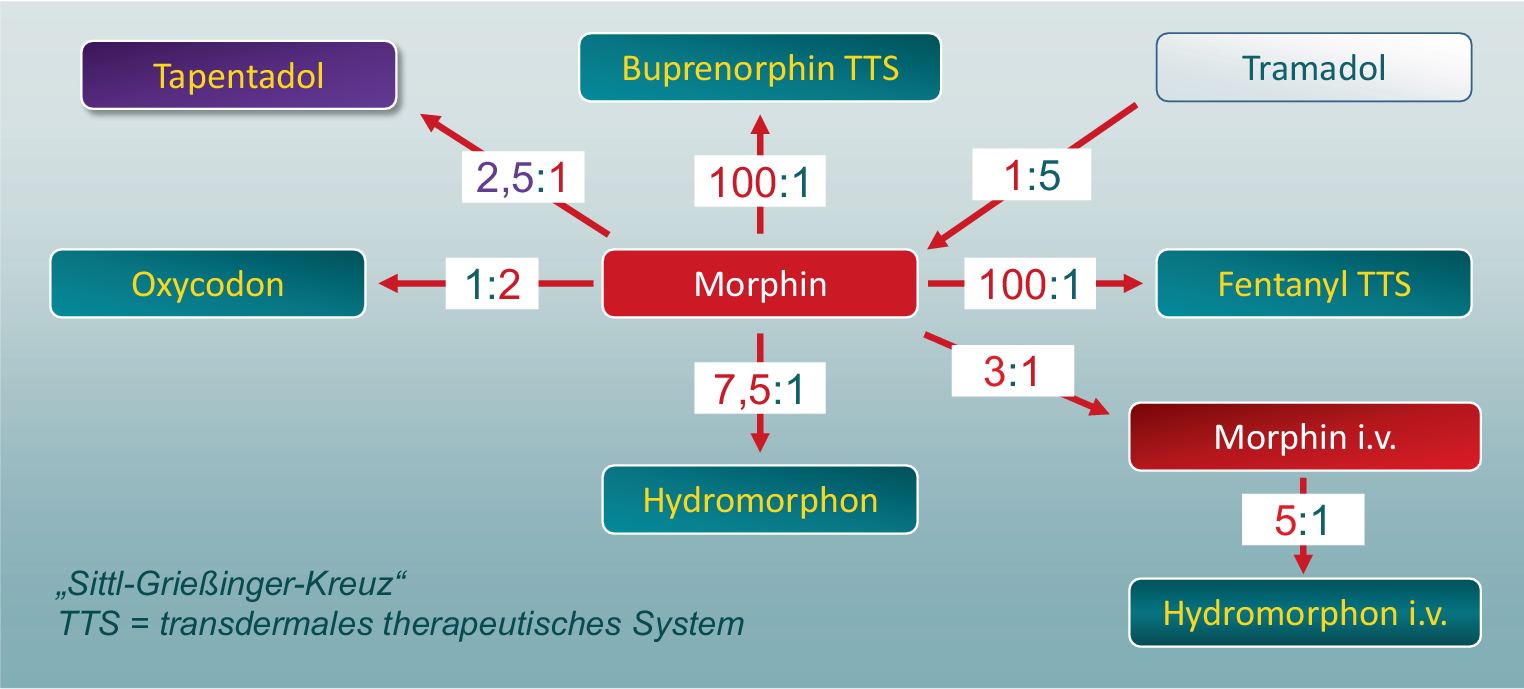 Für den Wechsel von einem Opioid zu einem anderen werden sogenannte Äquipotenztabellen für die Umrechnung der Dosierung herangezogen, die hauptsächlich auf Erfahrungswerten beruhen [8]. Ein Beispiel hierfür findet sich in Abb. 1.