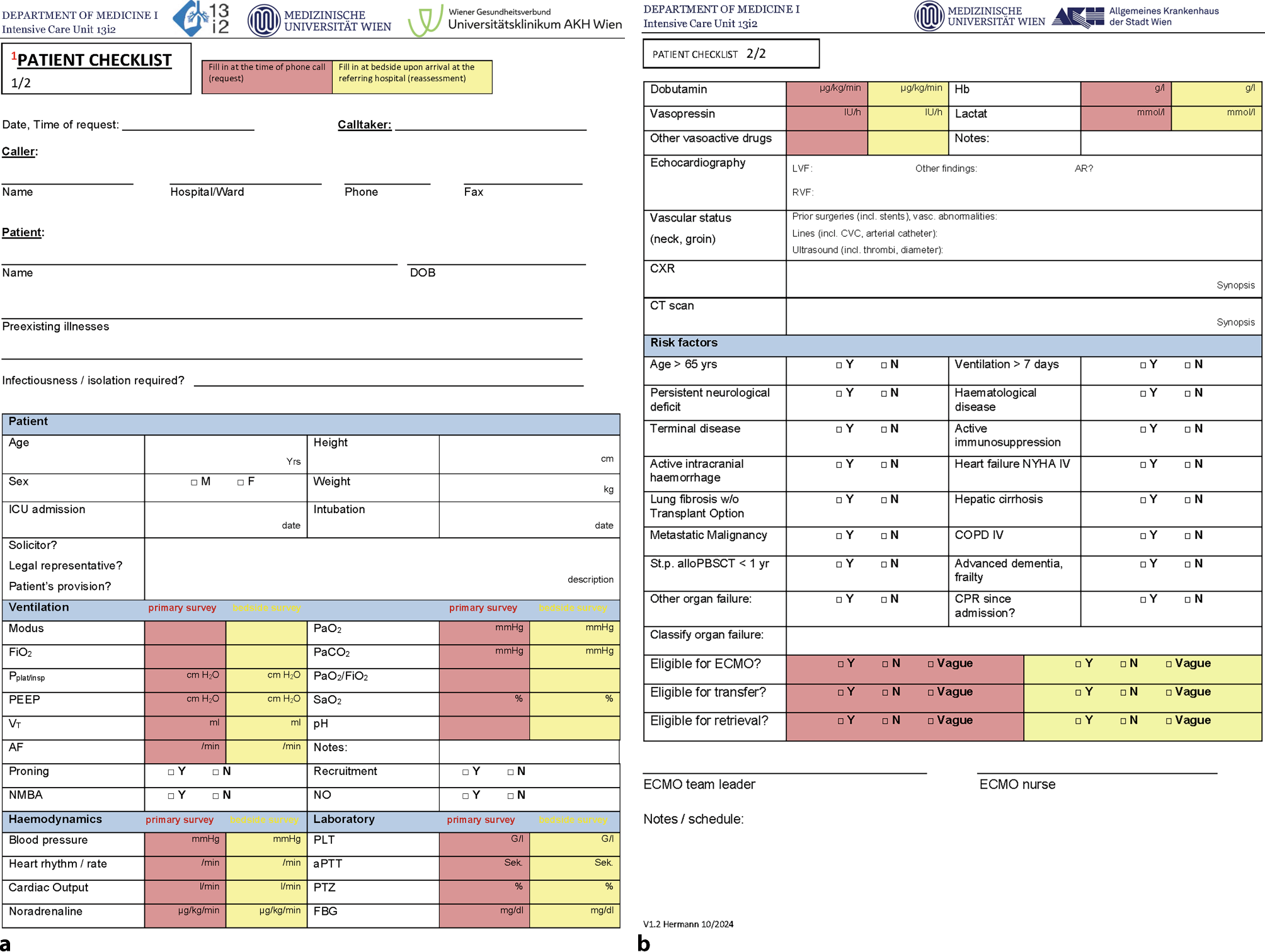 Referring institutions may be ICUs, emergency departments and intermediate care units; however, emergency transport companies may also request evaluation for ECMO retrieval. Contact details as well as basic information about the program are published online (https://www.muv.ac.at/13i2). Requests are usually received by telephone. Each case is discussed individually in a conversation between the attending senior physician at ICU 13i2 and the treating physician at the referring institution. We regard the use of our adapted patient checklist based on our own evaluation sheet [17] as mandatory (see Fig. 2a, b) to meet our demands for both evaluation and documentation standards.