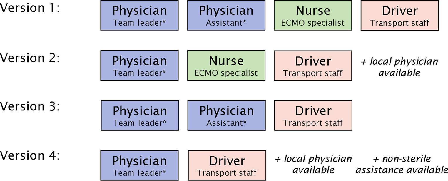 The team composition is flexible depending on personnel resources and transport factors. It allows four different versions when a ground-based approach is conducted (see Fig. 3). For an air-bound transport, team compilation is adapted to the air ambulance operator’s individual specifications. The option with one physician only necessitates the availability of medical capacities at the referring institution (at least one physician or nurse for sterile guided assistance during cannulation), which is ascertained during the telephone conversation. The same requirement applies when no ECMO nurse is available for transport.