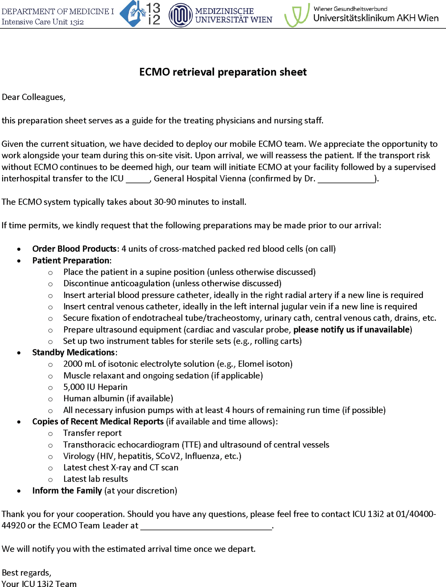 During the telephone conversation with the referring institution, information about the upcoming ECMO retrieval is provided. Subsequently, a 1-page preparation sheet is sent to the institution (Fig. 4). It serves as an information source containing key points about the upcoming retrieval and including specific preparation recommendations, such as ordering packed red blood cells at call or preparation of the ultrasound machine.