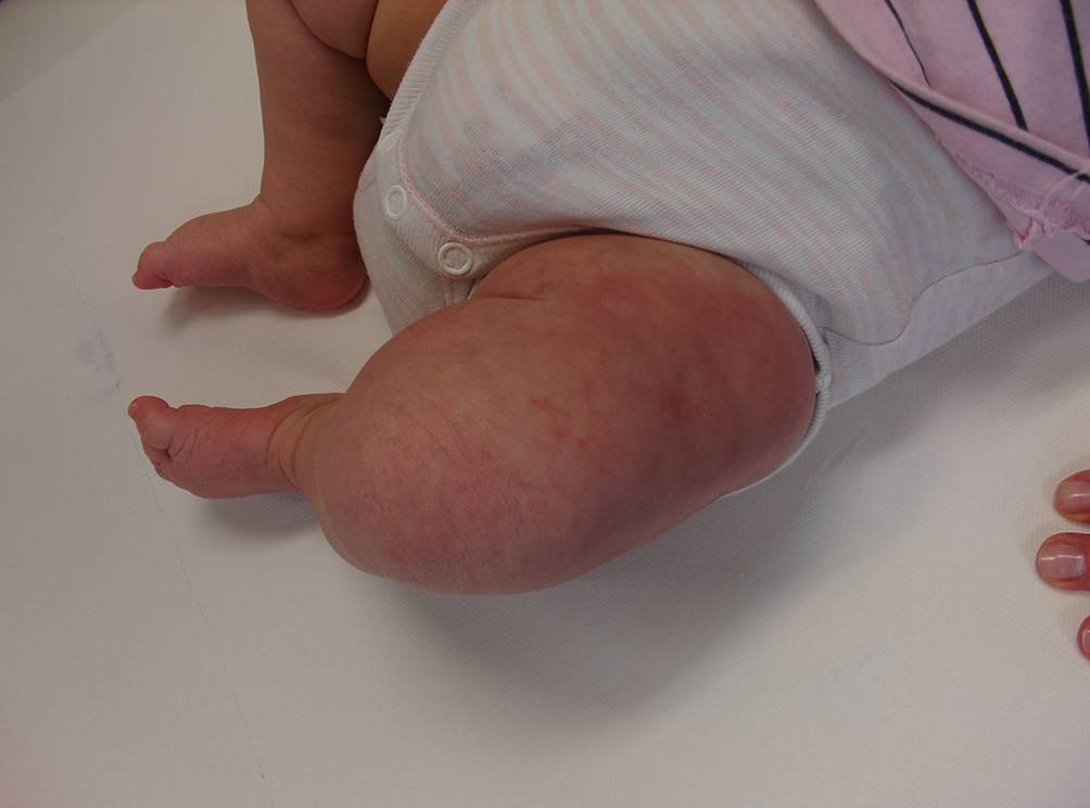 Patientin 1. Unscharf begrenzte, derb-knotige Resistenz mit livider Hautverfärbung im Bereich des linken Oberschenkels bei einem 3 Monate alten weiblichen Säugling