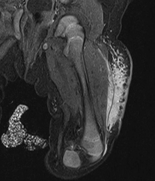 Die Erstvorstellung erfolgte wegen einer seit Geburt bestehenden lividen Verfärbung im Bereich des linken Oberschenkels (Abb. 1; Tab. 1). In der klinischen Untersuchung fand sich unter der Haut eine etwa 5 cm große, unscharf begrenzte, derb-knotige Resistenz. Im initialen Blutbild (6. Lebenstag) waren die Thrombozyten normal; vor Behandlungsbeginn waren dreimal diskret erniedrigte Thromboyztenwerte (minimal: 133 G/l) dokumentiert. Die Bestimmung der plasmatischen Gerinnung erfolgte erstmals im 3. Lebensmonat. Es zeigte sich eine leichte Erhöhung des D‑Dimers auf 1,69 mg/l (Normwert: −0,50) bei unauffälliger aktivierter partieller Thromboplastinzeit (aPTT), Prothrombinzeit (PZ), unauffälliger Fibrinogen- und Antithrombin(AT)-Werten. In der Magnetresonanztomografie (MRT) mit Angiografie, die im 2. Lebensmonat durchgeführt wurde, war eine kraniokaudal 7 cm × sagittal 5 cm × axial 1,8 cm messende Infiltration der Subkutis des Oberschenkels ventrolaterodorsal mit fleckigem knotigen Kontrastmittelenhancement und semizirkulärer Infiltration des Musculus rectus femoris und Musculus vastus lateralis sowie Musculus sartorius zu sehen (Abb. 2). Da differenzialdiagnostisch auch ein maligner Weichteiltumor in Betracht gezogen wurde, erfolgte eine Biopsie, deren Ergebnis mit einem kaposiformen Hämangioendotheliom (KHE) vereinbar war. Im Alter von 2,5 Monaten wurde eine Therapie mit Sirolimus (Gesamttagesdosis 0,1 mg/kg und Tag aufgeteilt auf 2 Einzeldosen; Zielspiegel 10–15 ng/ml) begonnen. In den ersten Wochen nach Therapiebeginn wurden deutlich erhöhte Spiegel gemessen, weshalb eine entsprechende Dosisreduktion erfolgte. Im Verlauf konnten dann mit einer sehr niedrigen Sirolimusdosis adäquate Serumspiegel erzielt werden. Allerdings kam es innerhalb von 3 Wochen nach Therapiebeginn zu einer deutlichen Größenzunahme, sodass auch wegen der Gefahr eines Kompartmentsyndroms eine zusätzliche Therapie mit Vincristin (0,025 mg/kg je Einzeldosis) in initial wöchentlichen Abständen eingeleitet wurde. Da die Läsion unter der Therapie kleiner und weicher wurde, konnten die Abstände zwischen den Vincristingaben auf zwei Wochen ausgedehnt und die antiproliferative Therapie nach einer Gesamttherapiedauer von 11 Monaten (19 Vincristingaben) beendet werden. In der MRT-Kontrolle (8. Behandlungsmonat) zeigte sich eine deutliche Befundregredienz. Nachdem sich bei weiteren Kontrolluntersuchungen eine zunehmende Überwärmung der Läsion fand, erfolgte im Alter von 26 Monaten eine neuerliche MRT-Untersuchung. Da die Läsion deutlich an Größe zugenommen und die Ausdehnung der Ausgangsuntersuchung erreicht hatte, musste die Sirolimustherapie wiederaufgenommen werden. Die Therapie wurde während der nun 16 Monate dauernden 2. Therapiephase wegen verschiedener unkomplizierter Infektionen (Varizellen, Harnwegsinfekt, Gingivostomatitis) mehrfach kurzfristig unterbrochen. Daneben wurden gehäuft nicht behandlungspflichtige aphthöse Läsionen im Mundbereich berichtet. Das klinische Leitsymptom der Erkrankungsprogression (Überwärmung) hat sich im Verlauf deutlich gebessert (Abb. 3).