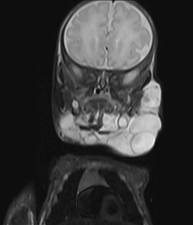 Bei dieser Patientin wurde bereits in einem pränatalen MRT eine ausgedehnte, überwiegend makrozystische Veränderung mit Punctum maximum inframandibulär beidseits, die bis an den Meatus acusticus externus, die Schädelbasis und die Infratemporalregion heranreichte, beschrieben (Tab. 1). Es fanden sich Ausläufer bis in den Zungengrund sowie den Oro- und Hypopharynx. Ab dem 2. Lebenstag erhielt die Patientin Sirolimus. Die erste postpartale MRT erfolgte am 5. Lebenstag und zeigte eine gemischte groß- und kleinzystische lymphatische Malformation (Abb. 4). Zur Sicherung der Atemwege erfolgt unmittelbar postpartal die gesetzte Intubation und am 16. Lebenstag die Anlage eines Tracheostomas sowie die erstmalige Sklerosierung der großzystischen Areale durch Instillation von OK 432. Die Betreuung erfolgte interdisziplinär durch Kinderchirurgie, pädiatrische Hämato-/onkologie und pädiatrische Pulmonologie. Weitere OK-432-Instillationen wurden im 2. und 5. Lebensmonat durchgeführt. Sirolimus wurde insgesamt ausgezeichnet toleriert. Die Dosen wurden nach Körpergewicht und Serumspiegel entsprechend adaptiert und lagen zwischen 0,035 und 0,0625 mg/kg und Tag. Es traten zwar mehrfach fieberhafte respiratorische Infekte auf, die jedoch nicht über das bei nicht immunsupprimierten Patienten in diesem Alter übliche Ausmaß hinausgingen. Es kam klinisch und radiologisch zu einer deutlichen Größenabnahme der lymphatischen Malformation, die auch in der im Alter von 6 Monaten durchgeführten MRT bestätigt wurde (Abb. 5).