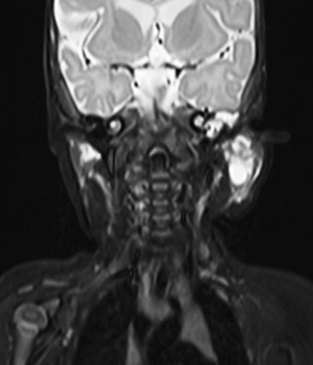 Patientin 2. Im koronalen T2-Magnetresonanztomogramm findet sich eine gemischte mikro-/makrozystische Läsion mit Punctum maximum am Hals rechts, die auch auf die Gegenseite reicht