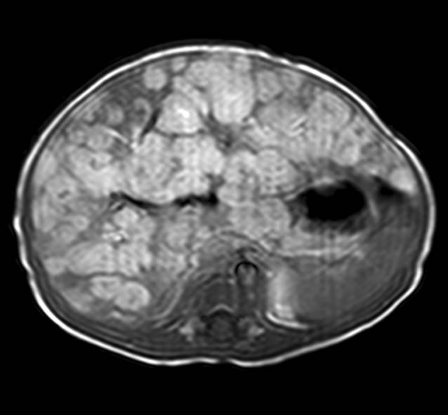 Im Rahmen der 1. Mutter-Kind-Pass-Untersuchung fiel bei der Patientin ein ausladendes Abdomen auf (Tab. 1). Das Hautkolorit war blass, das Abdomen druckdolent, die Leber 3 Querfinger unter dem Rippenbogen tastbar. Die Herzfrequenz lag bei 150/min. Es fanden sich außerdem multiple kutane Hämangiome, jedoch durchwegs in einer Größe von ≤5 mm. In der MRT kamen multiple, die gesamte Leber durchsetzende hyperperfundierte Läsionen zur Darstellung (Abb. 6). Die initiale basale Thyreotropin(TSH)-Konzentration war auf 42,37 mU/l (Normwert: 0,45–10,0) erhöht, während die Konzentrationen an freiem Trijodthyronin (fT3) und freiem Thyroxin (fT4) normwertig waren. In der Echokardiografie fanden sich keine Zeichen einer kardialen Dekompensation. Es wurde umgehend eine perorale Therapie mit Prednisolon (2 mg/kg und Tag), Propranolol (Tag 1: 1 mg/kg und Tag, ab Tag 2: 2 mg/kg und Tag) und Levothyroxin (25 μg) begonnen; Prednisolon wurde 2 Wochen lang volldosiert verabreicht und anschließend über 1 Woche ausgeschlichen. Es erfolgten sonografische Kontrollen, anfangs in 2‑wöchigen, dann in 4‑ bzw. 6‑wöchigen Abständen, wobei rund 2 Monate nach Therapiebeginn die schlechtere Abgrenzbarkeit der Einzelherde für eine beginnende Rückbildung sprach. Die Propranololtherapie wurde in einer Dosis von täglich 1,5 mg/kg für 11 Monate fortgeführt und schließlich nach Dosisreduktion über 4 Wochen knapp ein Jahr nach Beginn beendet. In der MRT-Untersuchung konnten keine Läsionen mehr nachgewiesen werden. Levothyroxin wurde nach einer Therapiedauer von 2 Monaten abgesetzt. Die kutanen Hämangiome waren langsam regredient und bildeten sich ebenfalls vollständig zurück.