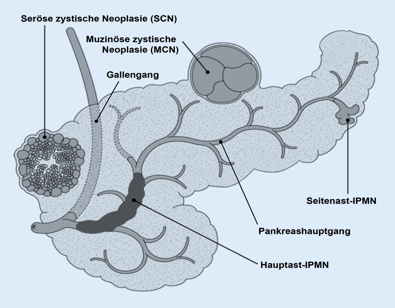 Mehr als 80 % der zystischen Neoplasien des Pankreas (PCN) sind muzinöse zystische Neoplasien (MCN), seröse zystische Neoplasien (SCN), intraduktale muzinöse Neoplasien des Pankreas (IPMN), die sehr seltenen soliden pseudopapillären Neoplasien (SPN) und zystischen neuroendokrinen Tumoren. Generell sind MCN und IPMN – also muzinöse Zysten – als maligne Vorstufen zu werten, da eine Progression zu einem Pankreaskarzinom erfolgen kann. Dies gilt ebenfalls für die sehr seltenen SPN und zystische neuroendokrine Tumoren des Pankreas.