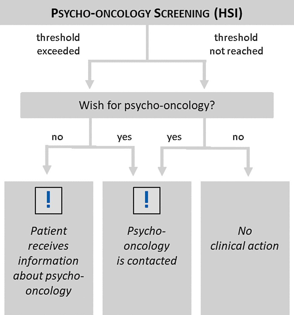 Pathways of clinical action due to psycho-oncological screening. Depending on the screening outcome of the Hornheider Screening Instrument (HSI), different clinical actions are executed. The blue exclamation mark is shown as an indicator of necessary clinical action for healthcare professionals. Adapted from Schäffeler et al. [45]