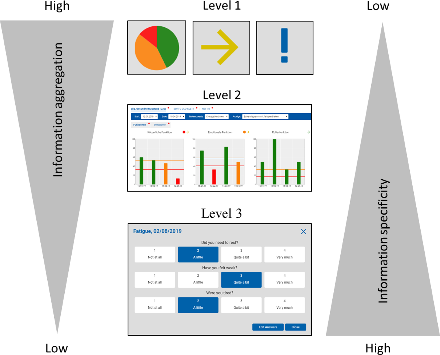 Levels of information depth and aggregation in the software. Information is most condensed on level1: In the pie chart, arrow (delta indicator of change between the last assessments) and psycho-oncology flag (exclamation mark shown for psycho-oncological treatment indication) all questionnaires and subscales are aggregated. Subsequently, this level conveys the least specific information. Level2: Healthcare practitioners can choose to explore the ePRO data in depth, by viewing the questionnaires’ subscales and their trajectories. On this level, information is more specific. Level3 (highest information specificity): If even more detailed information is needed, the answers to items of a specific subscale can be viewed. ePRO electronic patient-reported outcome