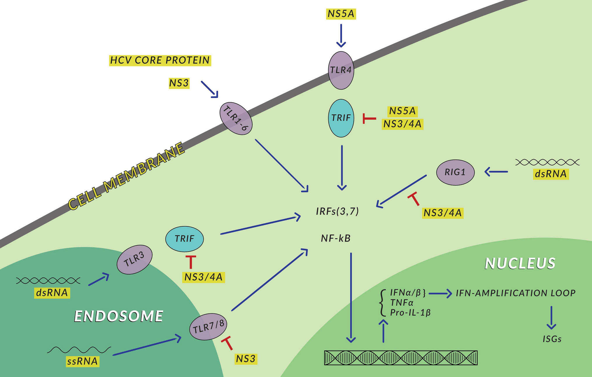 Expression of PRRs in hepatitis B and C was noticed by several authors, including ourselves (Mozer-Lisewska et al. 2010). Two PRRs RIG-1 and TLR3 are considered crucial to establish antiviral conditions in an organism infected with hepatitis C virus (HCV). They both sense double-stranded RNA, essential in the HCV replication cycle, activate transcription factors IRF3 and IRF7, which results in the synthesis of type IFNs anti-HCV agents. HCV reduces TRIF, a critical TLR3 adaptor, which hampers the IFN antiviral effect (Wang et al. 2009). Imran et al. (2012) searched the data from PubMed and Google Scholar concerning the effect of the HCV proteins on PRRs in the liver. They found that some of these proteins exert negative impact on PRRs pathways, helping to evade host immune response. For example, core monomeric protein stimulates the TLR2 pathway, helping the virus to evade host innate immunity. NS3/4A damage TLR3 and RIG-1 pathways. NS5A decrease expression NKG2D on natural killer (NK) cells via the TLR4 pathway, which results in the impairment of the functioning of these cells. The HCN NS3/4A protease was also revealed to cause specific proteolysis of adaptor protein TRIF linking TLR3, which impairs the signaling of the TLR3 pathway, promoting persistent infections (Li et al. 2005). These data unequivocally show direct interactions between the HCV proteins and the PRRs one (Fig. 1).