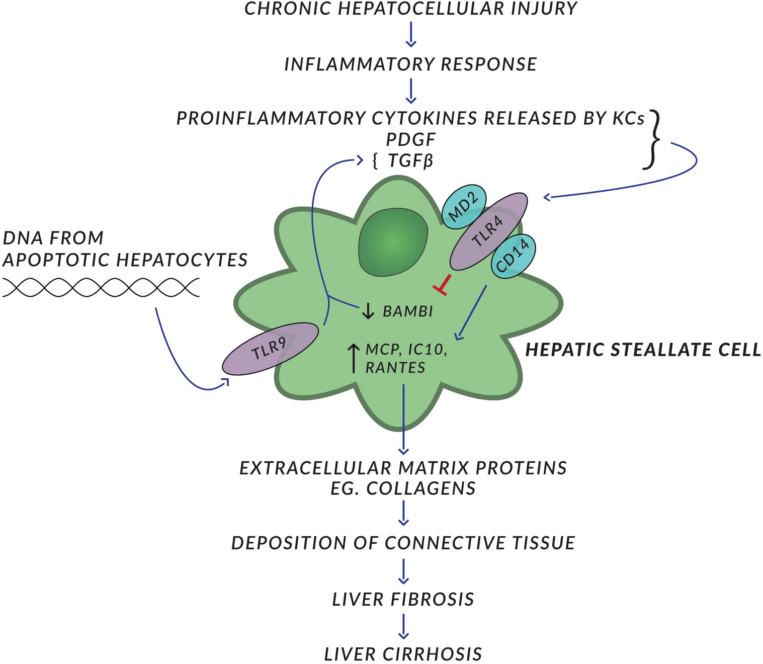 Liver fibrosis is a consequence of most hepatic pathologic disorders such as hepatitis, alcoholic liver disease, or fatty liver. Chronic hepatocellular injury followed by inflammatory response results in the production of several proinflammatory and/or immunosuppressive cytokines and accumulation of the variety of inflammatory cells. This inflammatory microenvironment activates HSC, which initiate the production of several extracellular matrix proteins, such as various subtypes of collagen. This leads to the deposition of connective tissue among hepatocytes, which leads to liver fibrosis and eventually to its more severe form, namely cirrhosis. Fibrogenic stimuli acting on HSC include TGF- β, platelet-derived growth factor, proinflammatory cytokines produced by Kupffer cells and others (Friedman 2008). Human HSC express TLR4 and its co-receptors MD2 and CD14 (Paik et al. 2003). TLR4 was found to upregulate several chemokines, such as MCP, RANTES, IP10 and to inhibit Bambi-type I TGF-β receptor but to be suppressant of TGF-β, activin and bone morphogenetic protein. Inhibition of Bambi by TLR4 enhances TGF- β signaling in HSC and thus has promoting effect on the augmentation of liver fibrosis (Guo and Friedman 2010). It is suggested that high levels of Bambi expression inhibit TGF-β signaling in HSC of normal livers (Aoyama et al. 2010) Apart from TLR4, HSC express also TLR2, TLR3 and TLR9. All upregulate HSC and TLR9 does it under the influence of host-derived denatured DNA from apoptotic hepatocytes (Fig. 2). Thus, TLR9 expressed on HSCs recognizing CpG-rich DNA seems to be another profibrotic agent. This leads to the differentiation of HSC and inhibition of their chemotaxis (Watanabe et al. 2007). Kupffer cells also participate in the formation of liver fibrosis through the activation of TLRs by lipopolysaccharides. It results in the production of several cytokines, including fibrogenic ones. The most significant of them all appears to be transforming growth factor (TGF)-β, binding receptor (TGF-β R1) on HSCs, which leads to the production and release of collagen fibers (Seki et al. 2007). Recently, Chinese and American authors have reported that mice with deleted TLR4 have been protected from chronic alcohol-induced liver disease and fatty liver (Jia et al. 2018). Stimulated NK cells are cytotoxic for activated HSCs via IFN type 1. TLR3 ligand poly:IC and IFN-γ apparently reduce liver fibrosis through TRAIL expression in NK cells (Radaeva et al. 2006). Cirrhotic individuals showed increased bacterial DNA in their plasma. Moreover, as mentioned earlier, denatured host origin DNA from dying cells stimulates HSCs via TLR9, which enhances liver fibrosis (Gabele et al. 2008).