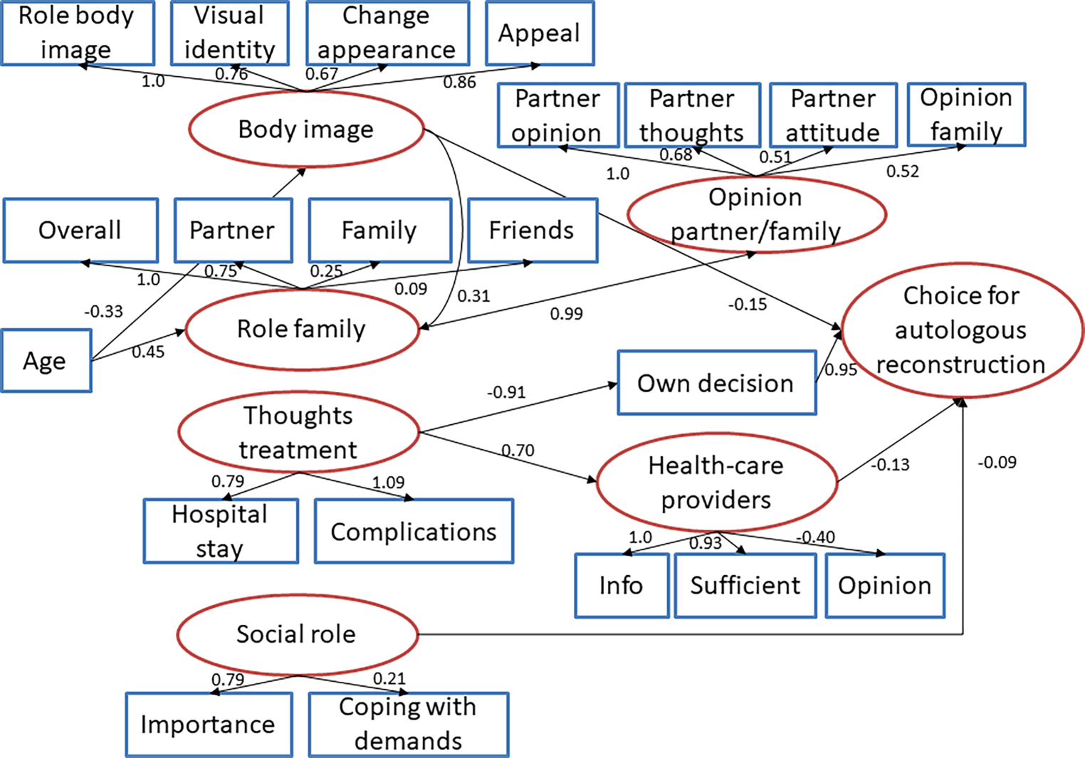 From 100 selected women, 72 women between 30 and 65 years of age (median 50.3 years, interquartile range 44–57 years) with breast reconstruction conducted in a single center in Vienna (Austria) consented to take part in this study. The role of family, social environment and healthcare providers during decision making, body image, thoughts about hospital stay and potential complications were assessed by a questionnaire. The decision for autologous tissue versus silicone implants was analyzed by structural equation modelling.