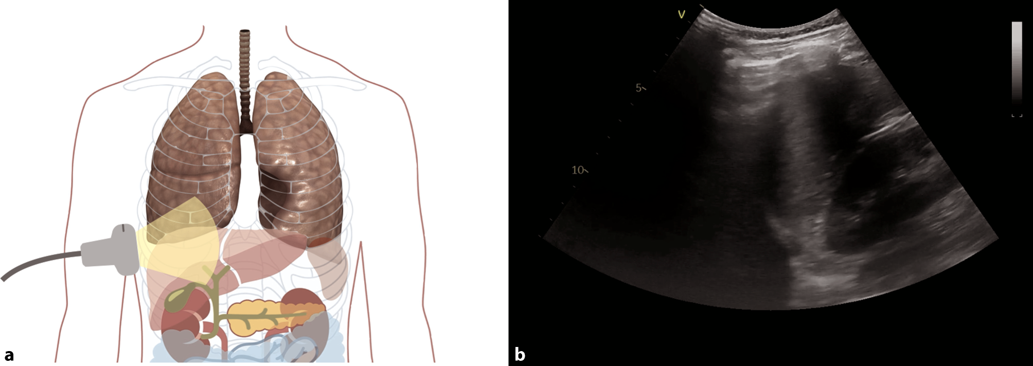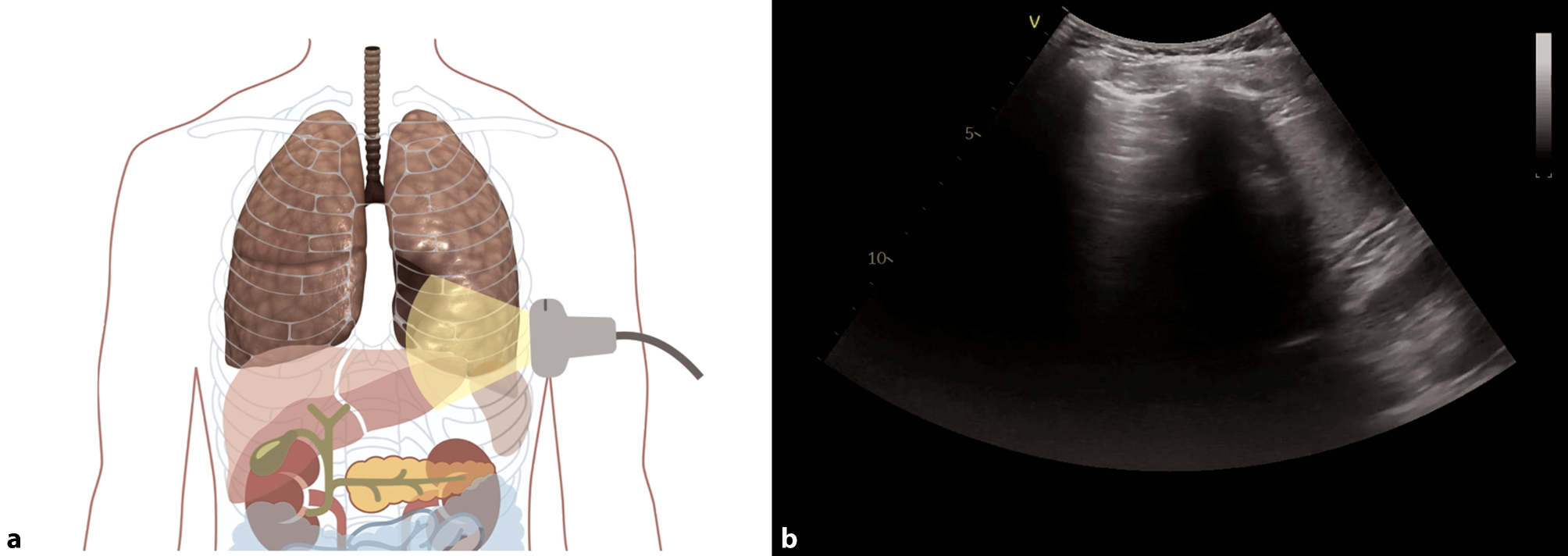 Evaluation for pleural effusion—right hemithorax. a Schematic of the right sided approach. b Normal sonographic anatomy without pleural effusion