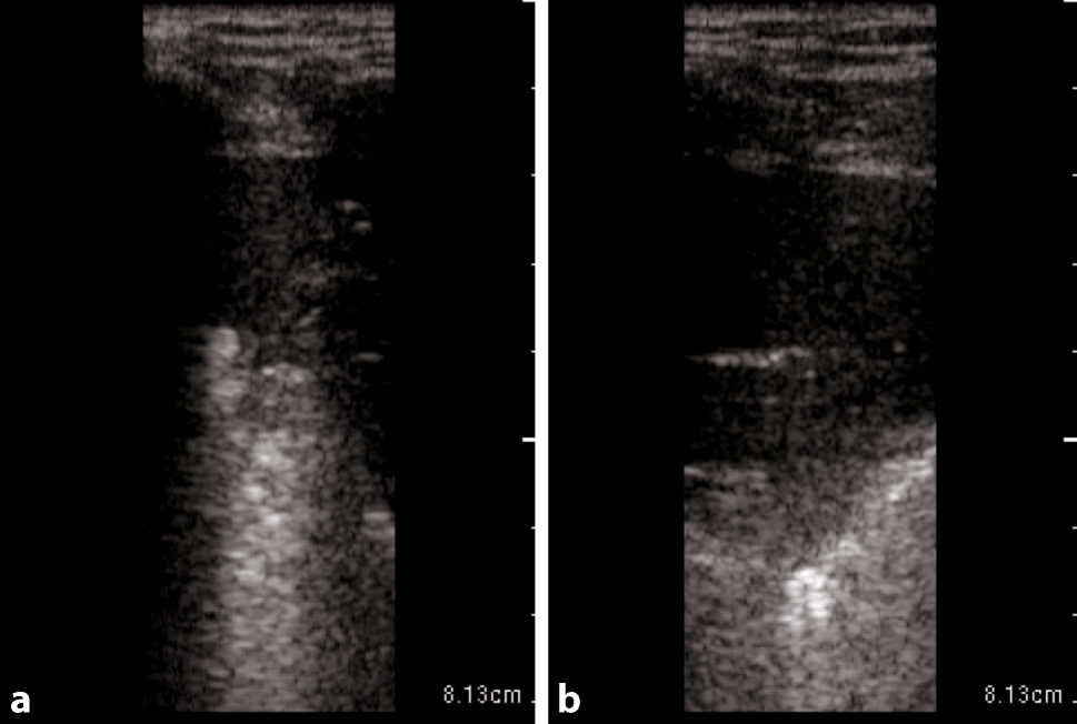 COVID-19 typical artifacts. a Fragmented pleural line with comet tail artifacts. b Fragmented pleural line with many comet tail artifacts