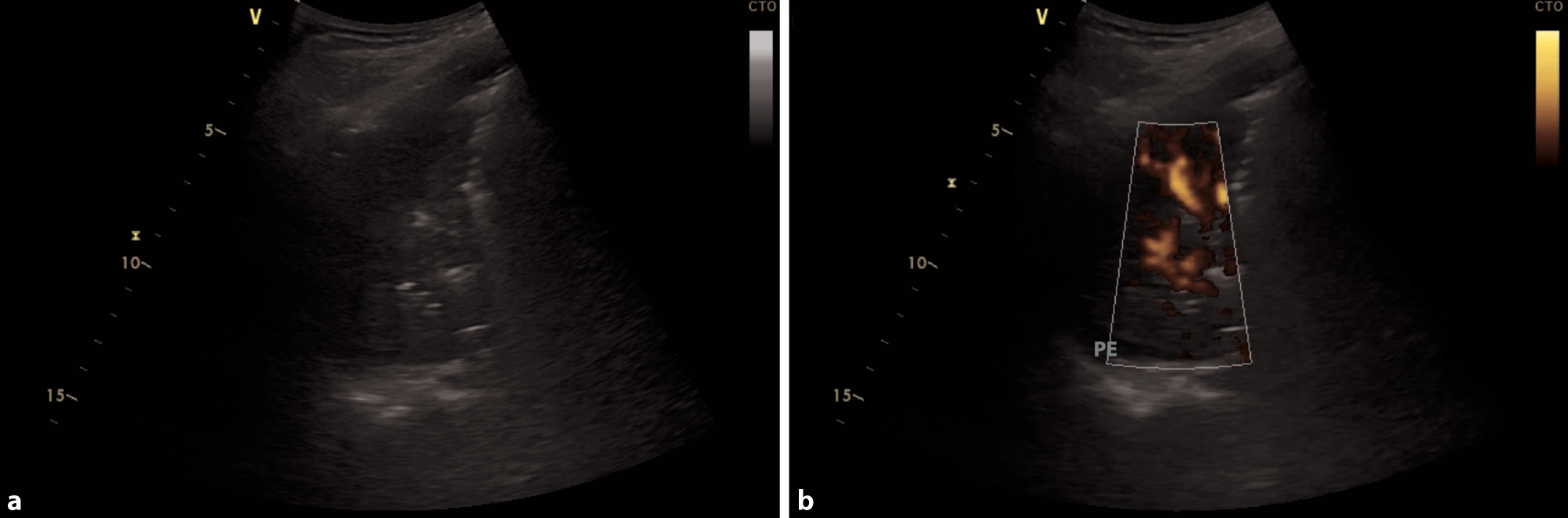 Bacterial superinfection of the left lower lung lobe in COVID-19. a Large consolidation with air bronchograms in a bacterial superinfection in COVID-19. b Same consolidation with power Doppler to display vascularization, a small pleural effusion is seen (PE)