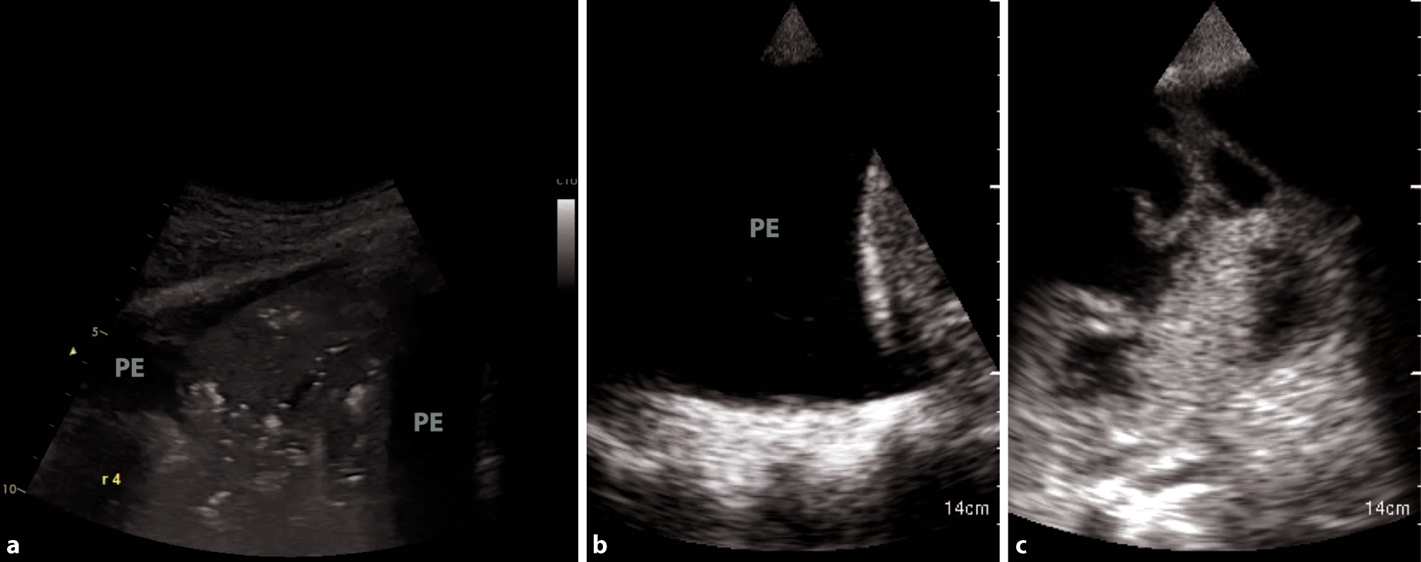 Different types of pleural effusion. a Consolidation with tissue-like appearance in pneumonia. PE pleural effusion. b Large, uncomplicated pleural effusion in heart failure. c Complicated pleural effusion, empyema
