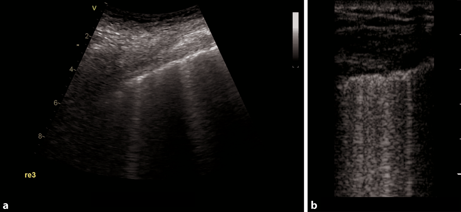 Patients who are critically ill often need to undergo procedures, for many of which a pneumothorax is a potential complication [15, 16]. In COVID-19, there are also cases with spontaneous pneumothorax described, making this entity an important differential diagnosis of acute respiratory distress [41]. In ultrasound, an easy protocol for detecting a pneumothorax can be applied [40]. Scanning should start at the highest point of the thorax, identifying whether lung sliding is present. Lung sliding corresponds to the motion of the parietal and visceral pleura. In a pneumothorax, there is gas between the parietal and visceral pleura, and pleural sliding is lost. The presence of pleural sliding rules out a pneumothorax [32]. In cases where there is an absence of lung sliding but a presence of vertical reverberation artifacts (B-lines, comet tails), a pneumothorax can be ruled out as well, as there has to be a connection between the parietal and visceral pleura to create such artifacts [32]. The presence of a lung pulse (a movement of the pleural line which is synchronous with the cardiac rhythm) rules out pneumothorax as well [42]. The most reliable rule in diagnosing a pneumothorax is the so-called lung point sign—the transition zone between the pneumothorax and the aerated lung (sliding on one side of the screen lung can be identified, whilst on the other, no lung sliding is present, video 2—lung point sign) [40]. It is recommended to use a point of care approach, performing a scan of the most anterior region (mostly in between zones 1 and 2) in a supine positioned patient [40].