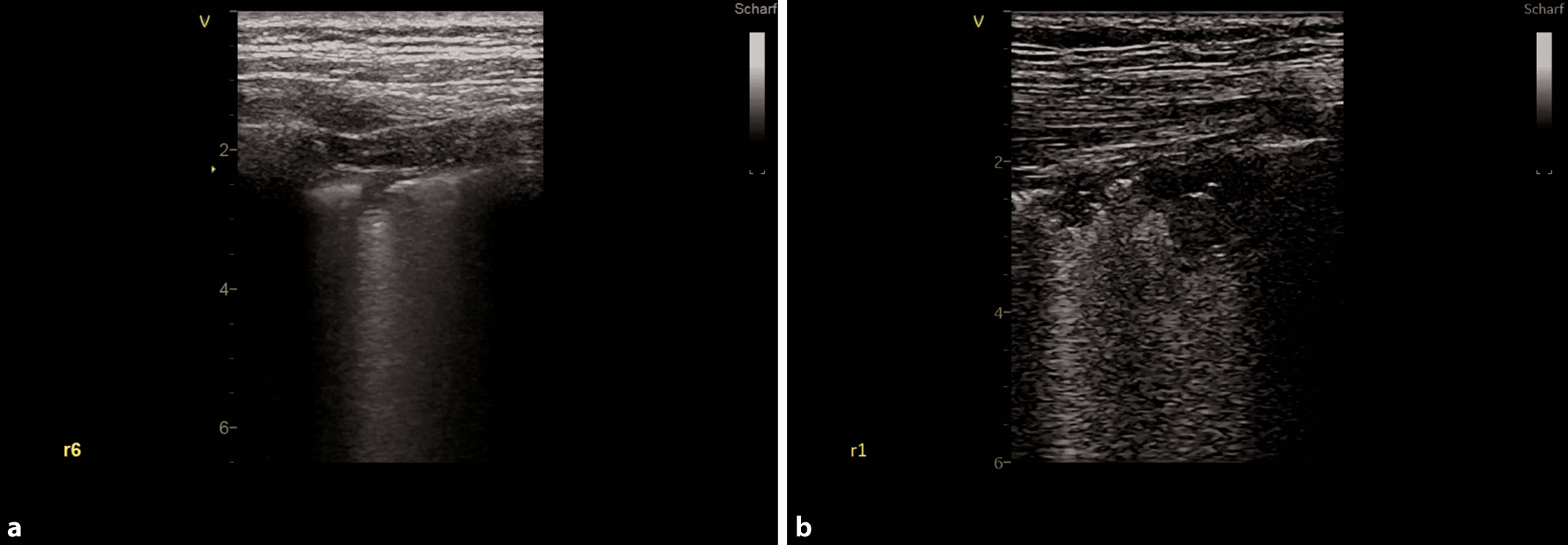 POCUS has been demonstrated to be a valuable tool to diagnose complications of COVID-19, such as pneumothorax or pleural effusions, or to confirm the suspected complications such as bacterial superinfections (Fig. 4a, c).