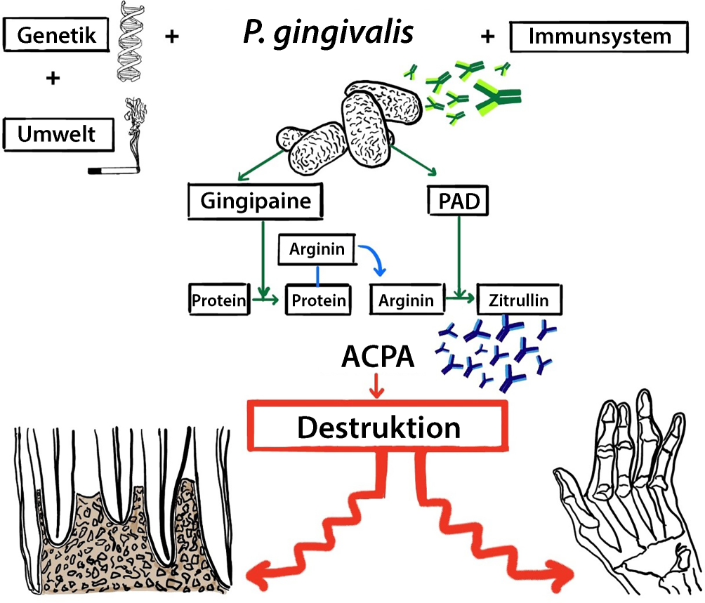 Die beiden chronisch-entzündlichen Erkrankungen rheumatoide Arthritis (RA) und Parodontitis (PA) stehen schon seit geraumer Zeit unter dem Verdacht, in unmittelbarem bilateralem Zusammenhang zu stehen. Aktuelle wissenschaftliche Literatur zeigt mögliche Parallelen in der Pathogenese und Therapie beider Krankheiten auf und diskutiert konkret kausale Zusammenhänge. Dabei steht neben genetischen Faktoren, Immun- und Umweltveränderungen der Parodontalkeim Porphyromonas gingivalis (P. gingivalis) im Zentrum. Das Bakterium P. gingivalis führt über verschiedene molekularbiologische Mechanismen zur Antikörperproduktion. Zu diesen Mechanismen zählen: Bildung zitrullinierter Proteine, Gingipaine, die Carbamylierung von Proteinen und Malondialdehyd-Acetaldehyd-Addukt-Formation. Gebildete Autoantikörper können schließlich zur Destruktion von Gewebe im Gelenk sowie im Parodont (dem Zahnhalteapparat) führen. Neben der Pathogenese der beiden Erkrankungen scheinen sich auch Therapien beider Erkrankungen gegenseitig positiv zu beeinflussen, weshalb eine interdisziplinäre Kommunikation zwischen Rheumatologie und Parodontologie sinnvoll und wünschenswert wäre, um den Verlauf beider Krankheiten mitzuverfolgen und abzuschätzen, ob Therapieversuche anschlagen. Somit würde die interdisziplinäre Zusammenarbeit zwischen Rheumatologie und Zahnmedizin einen wichtigen Schritt weiter in Richtung personalisierter Medizin – die Medizin der Zukunft – darstellen.