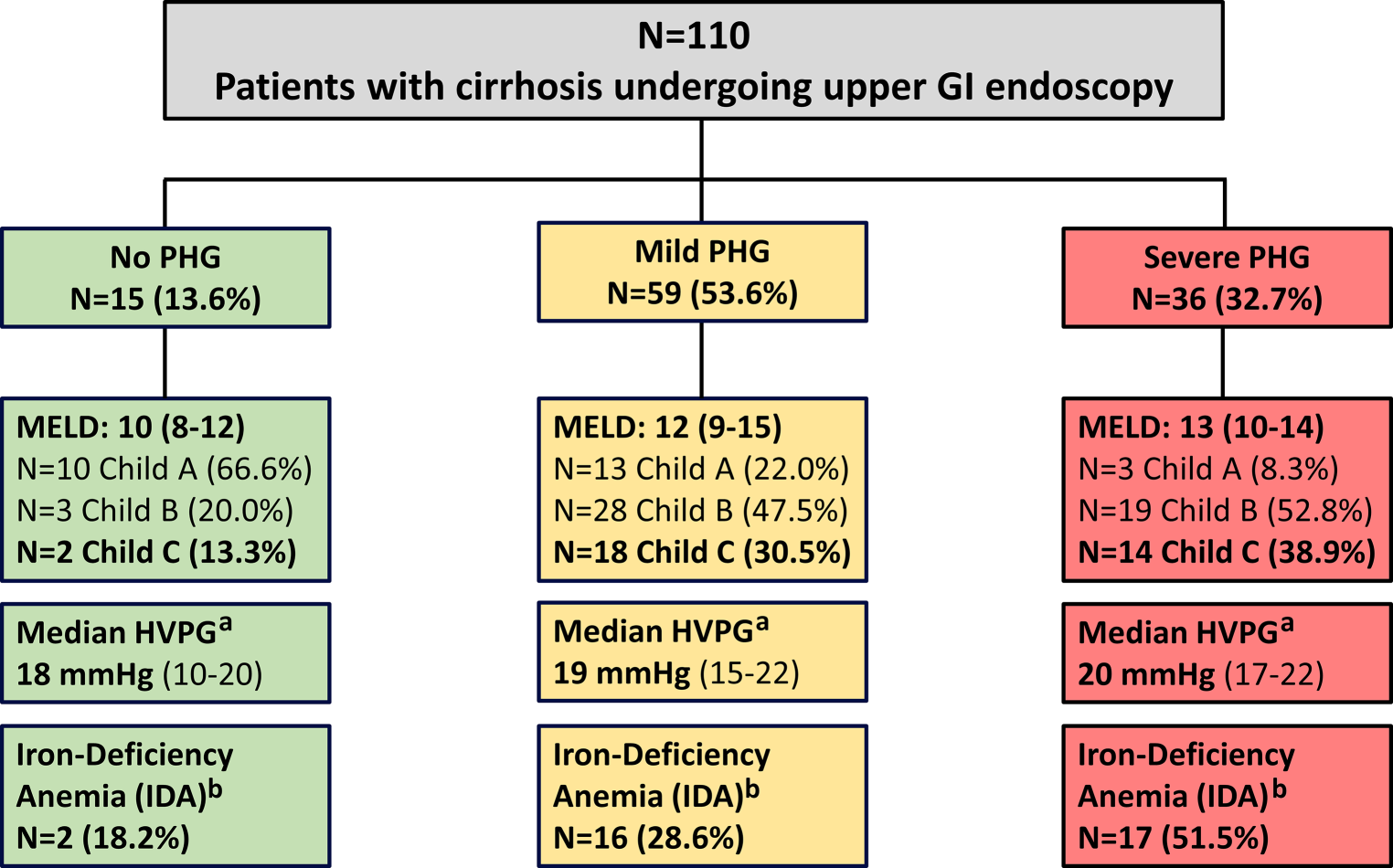 Patient flow chart. aData on HVPG missing in n = 47 (42.7%), available in n = 10, n = 34, n = 19 of patients without PHG, mild and severe PHG, respectively. bData on IDA missing in n = 10 patients (9.1%), available in n = 11, n = 56, n = 33 of patients without PHG, mild and severe PHG, respectively. GI gastrointestinal, PHG portal hypertensive gastropathy, MELD model for end-stage liver disease, HVPG hepatic venous pressure gradient, IDA iron-deficiency anemia