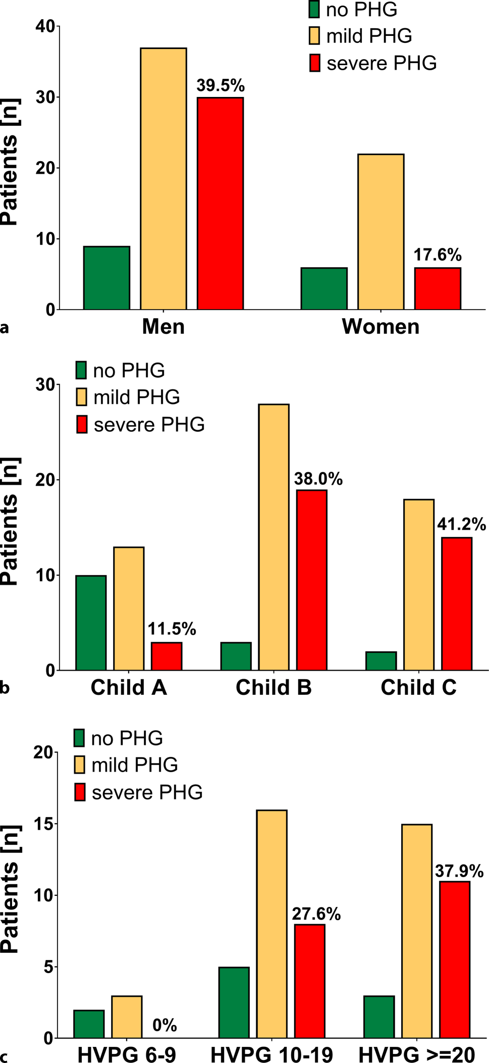 Prevalence and severity of portal hypertensive gastropathy according to a gender, b Child-Turcotte-Pugh stage and c severity of portal hypertension. PHG portal hypertensive gastropathy, HVPG hepatic venous pressure gradient