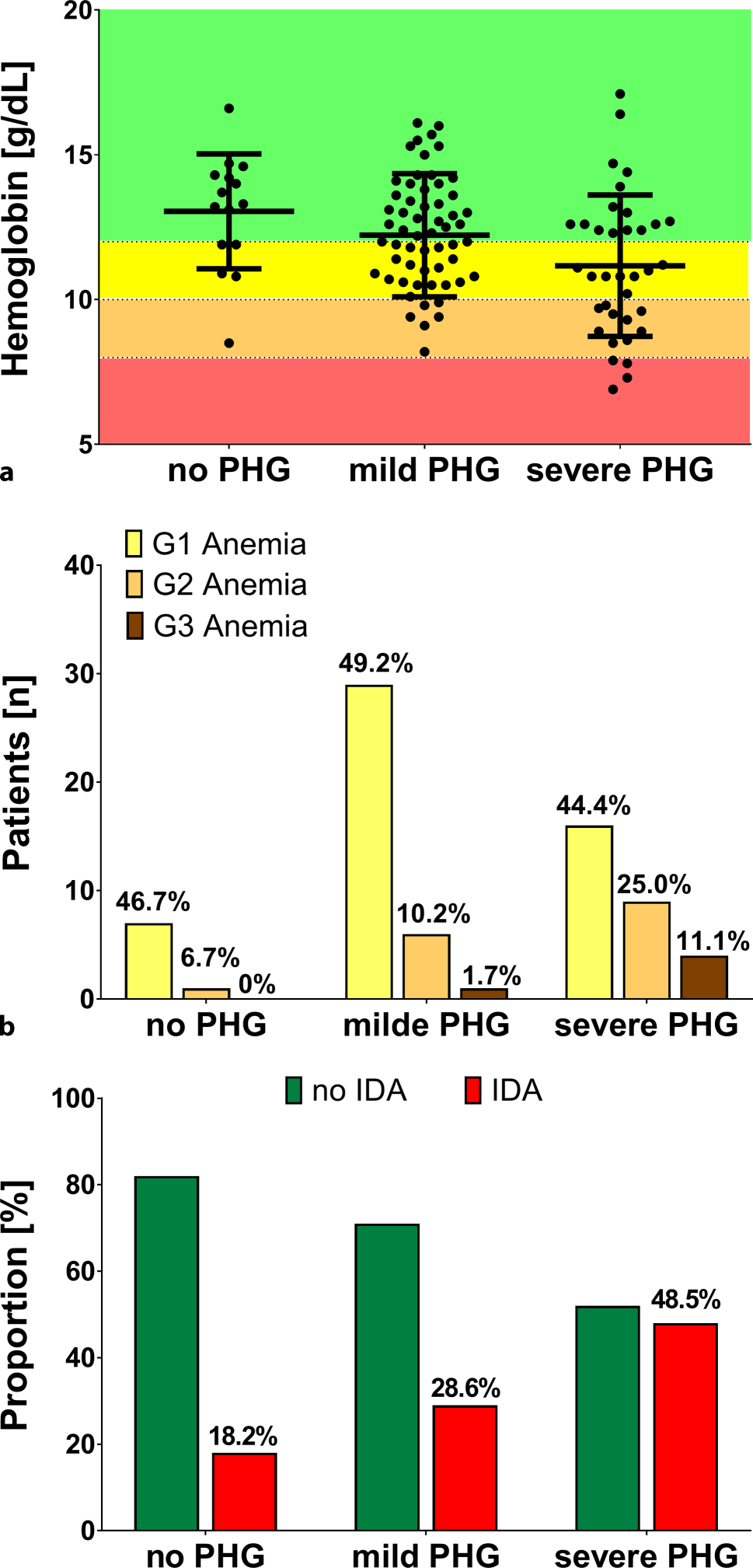 In this exploratory study, we aimed to investigate risk factors for severe PHG in regard to clinical, laboratory and hemodynamic characteristics. In addition, we explored the prevalence and severity of anemia in patients with PHG with particular focus on IDA.