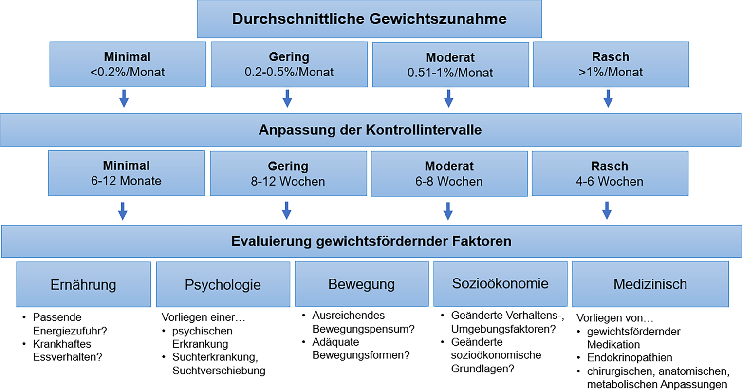 Bei einer minimalen bis geringen Gewichtszunahme stehen die Evaluierung und Forcierung der Lebensstilmaßnahmen (Ernährung, Bewegung, Verhalten; Tab. 2, Maßnahmen 2.3–2.5) im Vordergrund. Bei den jeweiligen Kontrollterminen, deren Intervalle an die Geschwindigkeit der Gewichtszunahme angepasst werden sollten, empfiehlt sich die Erhebung von gewichtsfördernden Faktoren (Tab. 1). Bei moderater und rascher Gewichtszunahme sollte neben den Lebensstilmaßnahmen an eine Erweiterung der Therapie mit ggf. Einsatz einer Pharmakotherapie zur Gewichtsreduktion und/oder chirurgischen Maßnahmen gedacht werden [1, 20‐23].