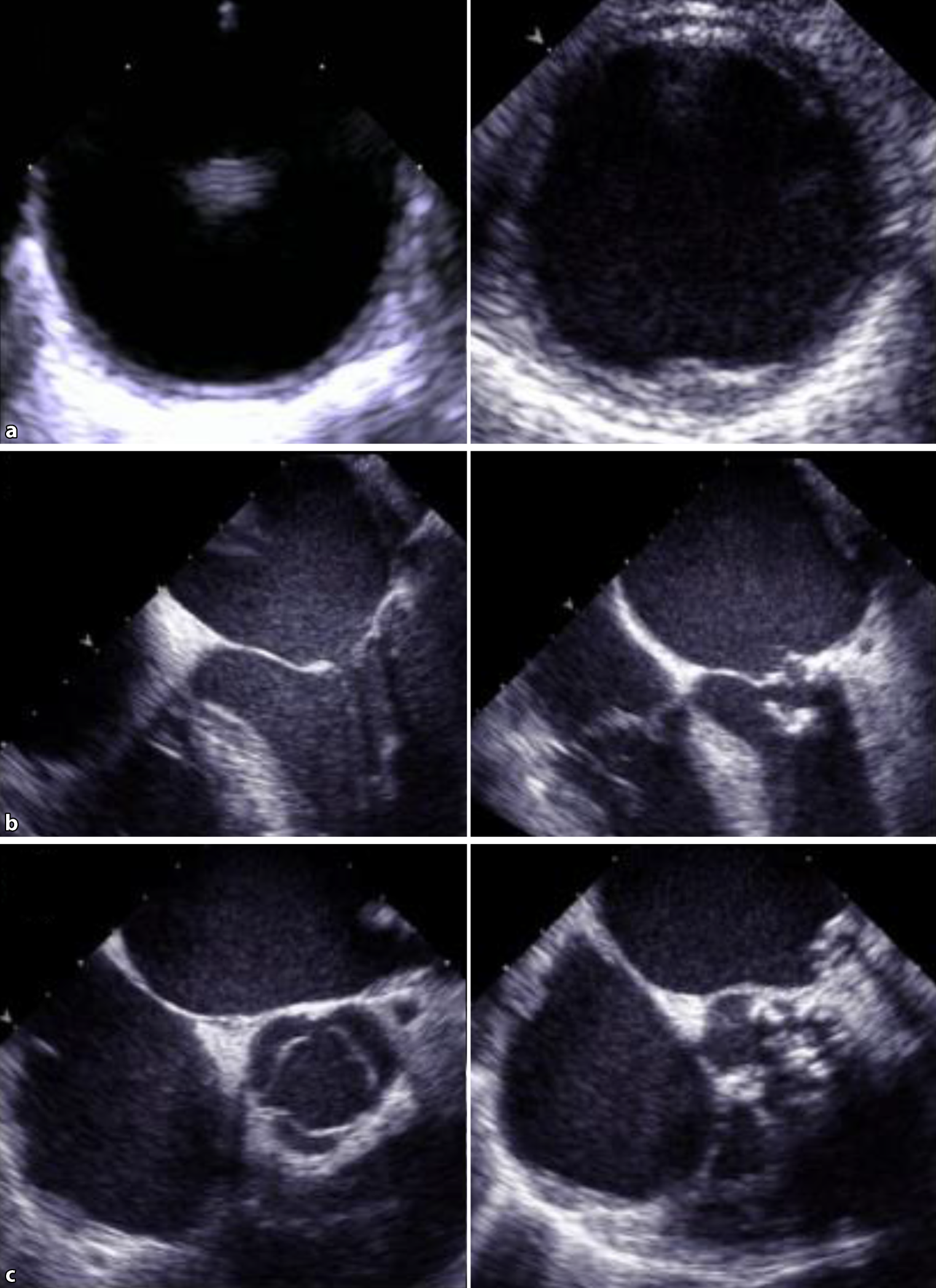Representative images displaying a transesophageal short axis view of the descending thoracic aorta (panel a) without (left side) and with (right side) aortic plaque, a transesophageal four-chamber view (panel b) with normal (left side) and severely calcified (right side) mitral valve, and a transesophageal short axis view of the aortic valve (panel c) with normal (left side) and severely calcified (right side) morphology