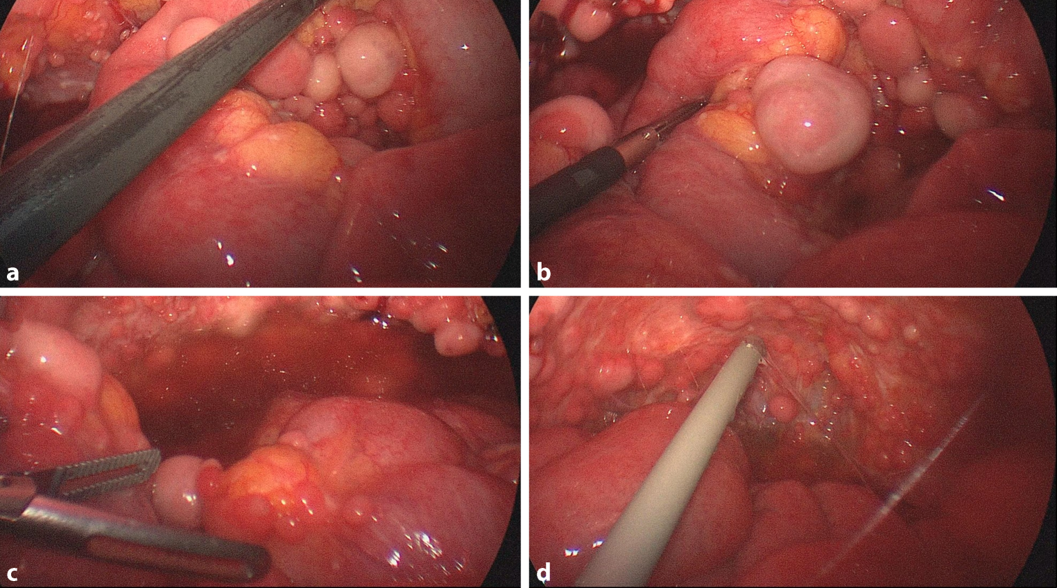 Diagnostic laparoscopy revealed diffuse 1–5 cm tense and spherical tumors in the mesentery (a and b), right paracolic gutter (c), and in the pelvis (d)
