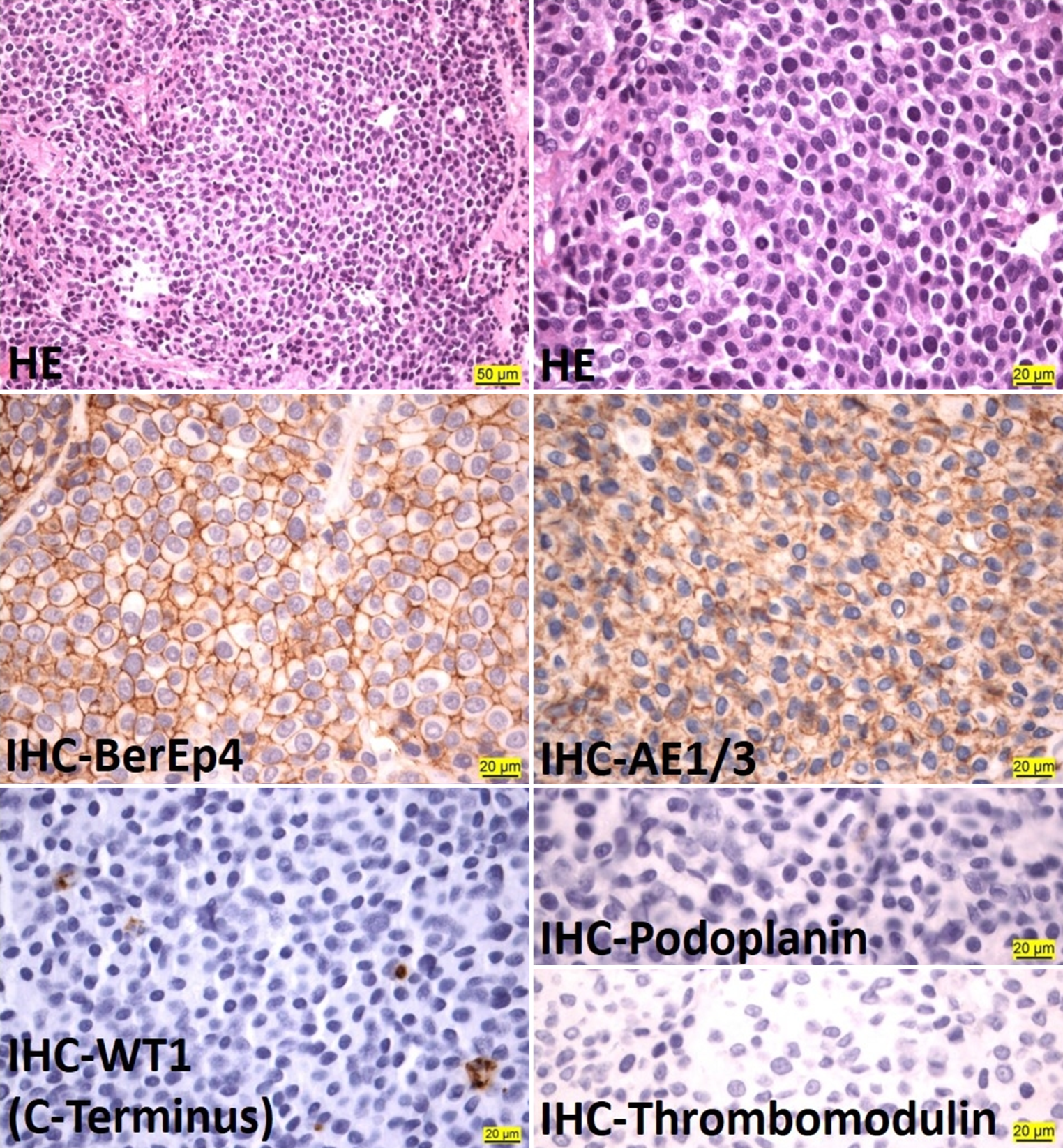 Hematoxylin–eosin (HE) staining and exemplary immunohistochemical (IHC) stainings (BerEp4, AE1/3, Wilms tumor protein 1 [WT1], podoplanin, thrombomodulin) of intraperitoneal biopsies. Scale bars are indicated
