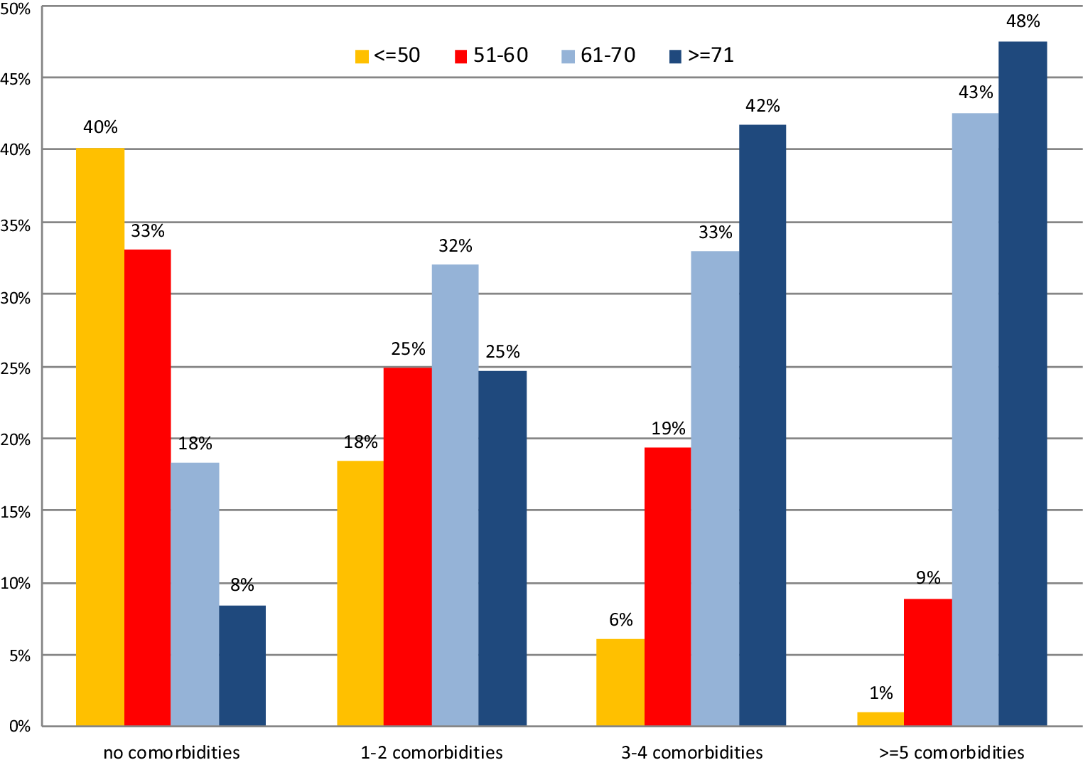 Distribution of patients (%) within particular age groups according to the numbers of comorbidities documented (these differences were statistically significant, chi-squared test p < 0.001)